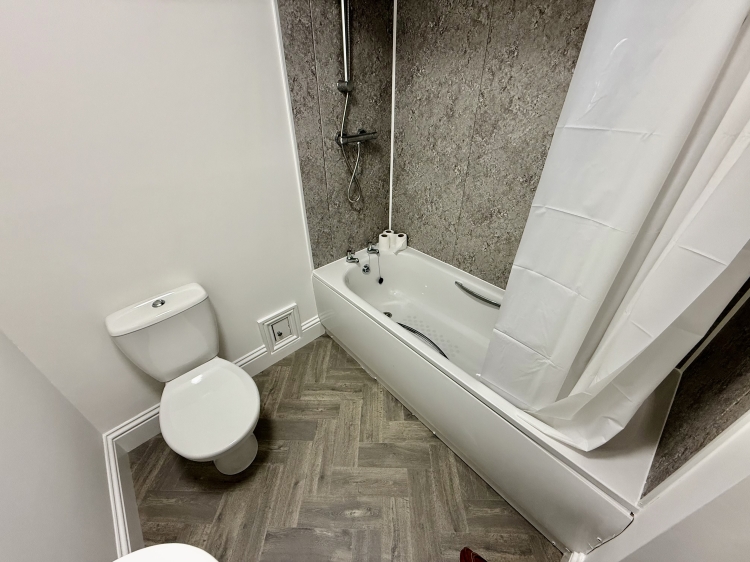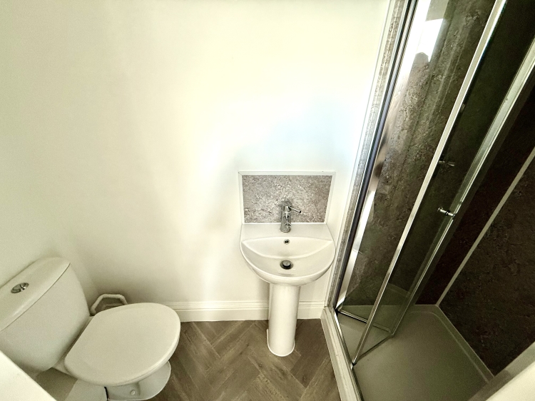 Fitted with a three piece suite comprising a walk in shower, pedestal wash hand basin and WC. Extractor fan, splashback panelling and chrome heated towel rail.