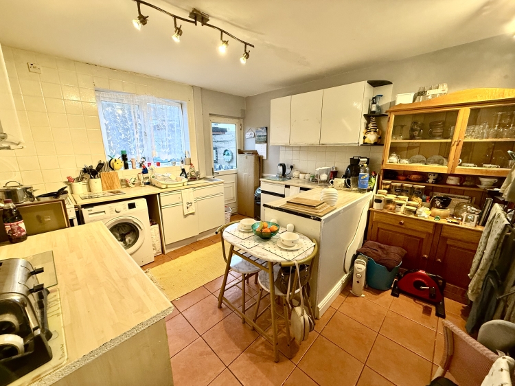 4.445m x 4.0894m - 14'7" x 13'5"<br>Fitted with a range of wall and base units, having contrasting work surfaces, incorporating a stainless steel sink unit with drainer. Double glazed window to the rear, UPVC external door, double glazed window to the front, tiled flooring, single central heating radiator, plumbing for an automatic washing machine and under stair storage cupboard.