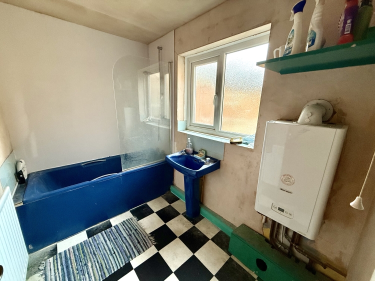 2.286m x 1.9558m - 7'6" x 6'5"<br>Fitted with a two piece suite comprising a panel bath and wash hand basin. Double glazed frosted window to the side and single central heating radiator.