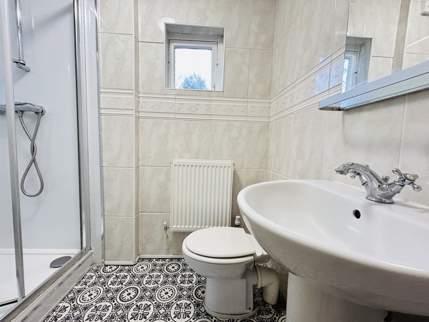 With shower cubicle housing power shower, pedestal washbasin, low level w.c, radiator, extractor fan.