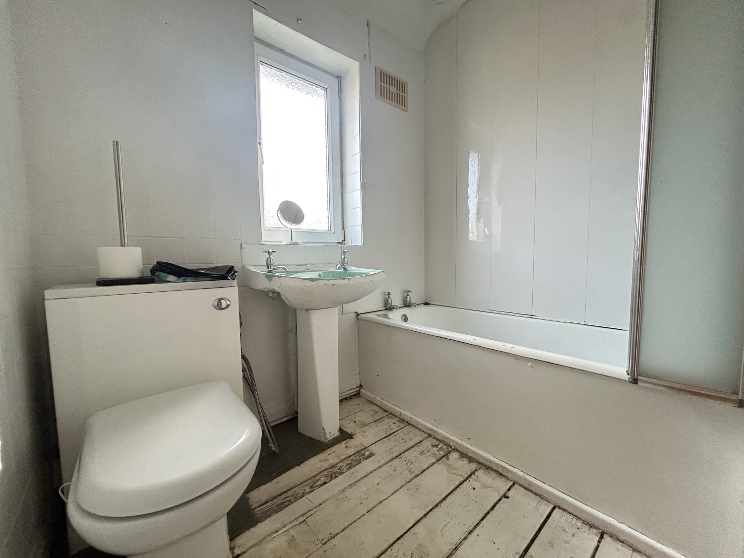 With a coloured suite comprising panel bath incorporating an over bath electric shower, pedestal hand wash basin, low flush WC, attractive glazed tiling to splash and vanity areas, radiator, wall mounted heater and uPVC framed double glazed window.