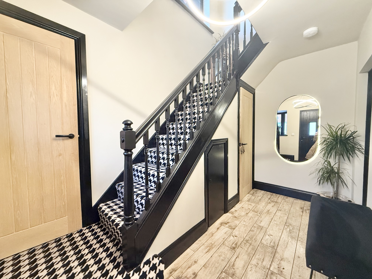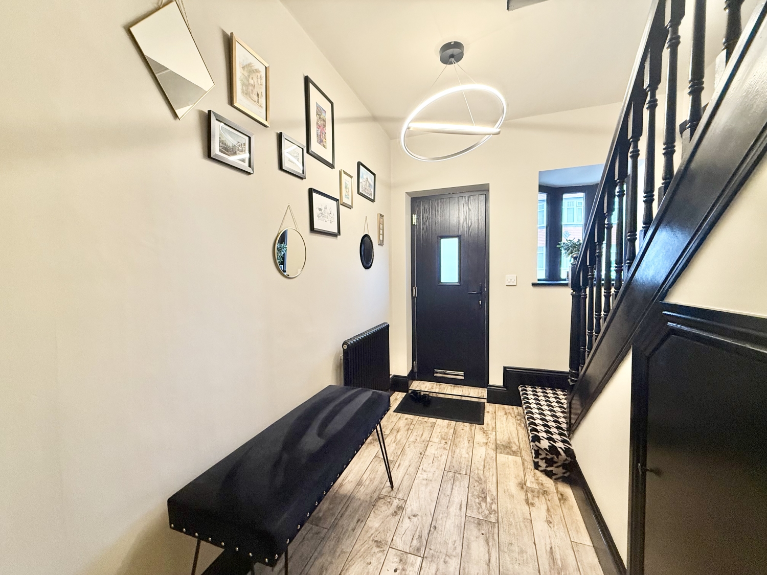 Entrance via composite door into entrance hallway, radiator, tiling to the floor, stairs leading to the first floor, UPVC double glazed bay window, access to ground floor WC
