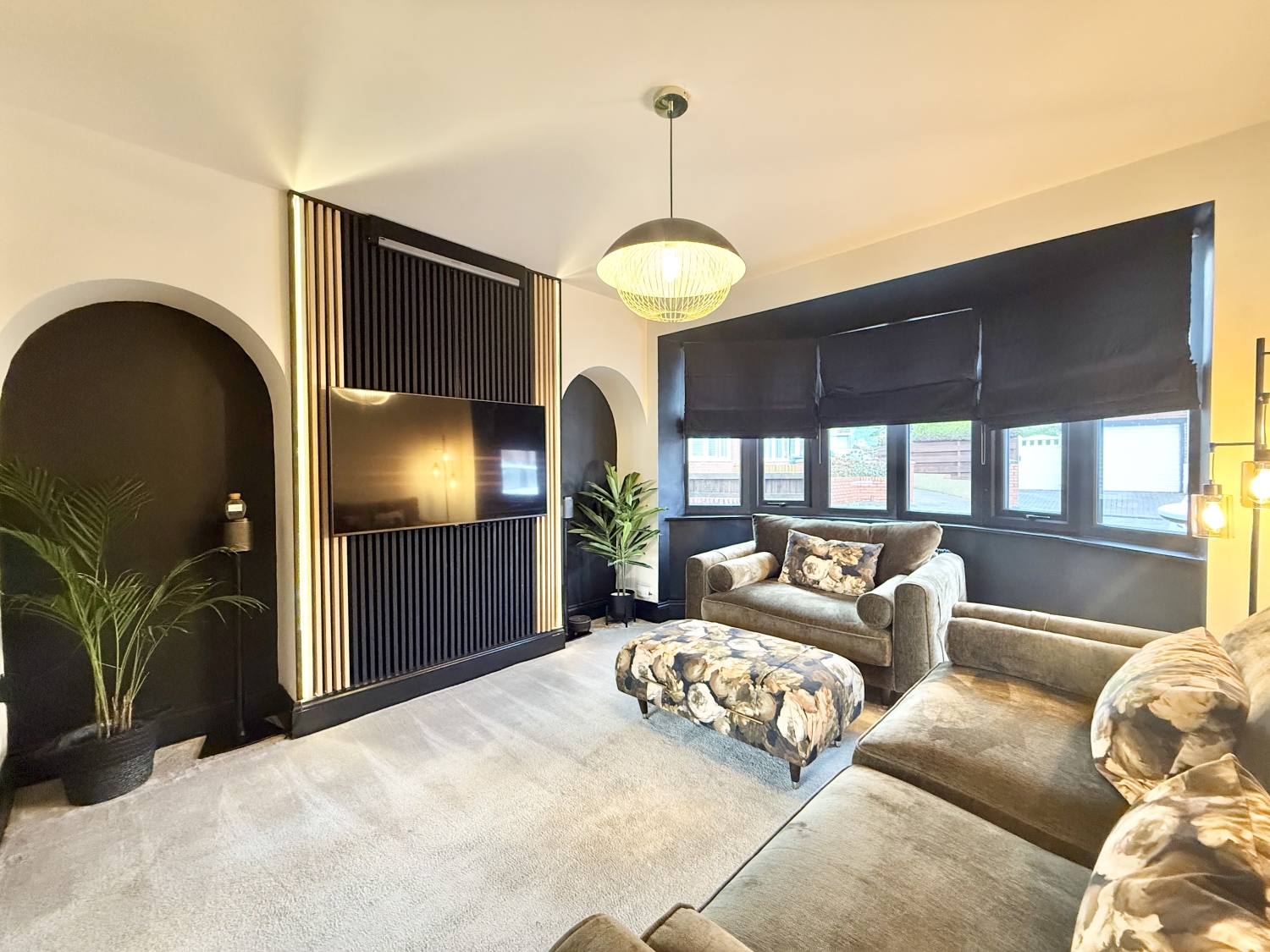 UPVC double glazed bay window, vertical radiator, UPVC double glazed sling doors accessing rear garden
