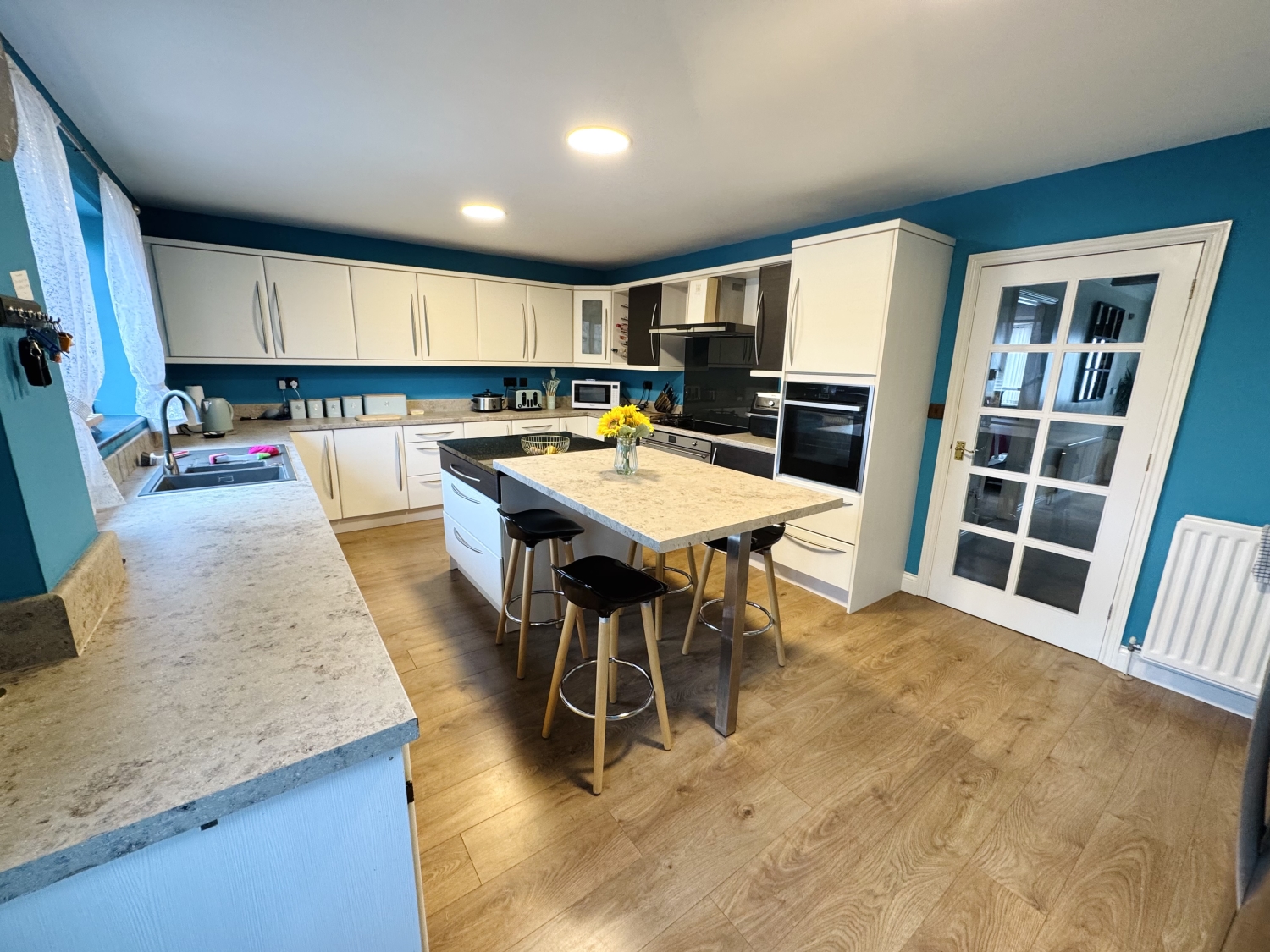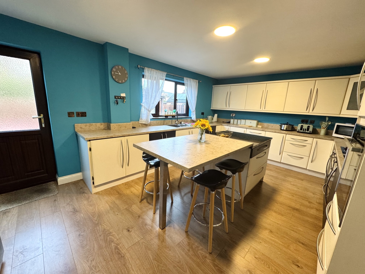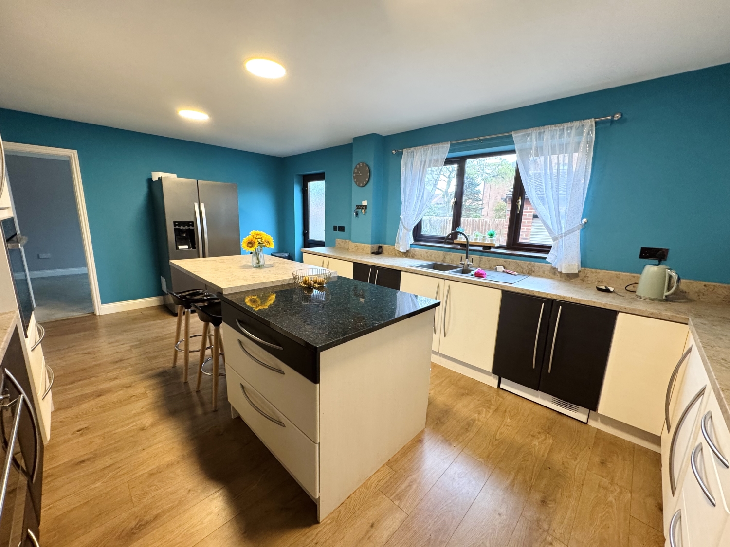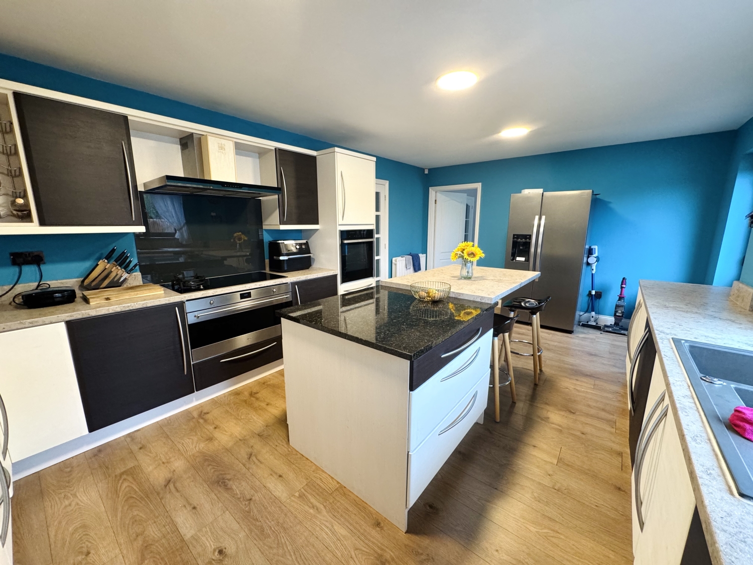 The kitchen is a masterpiece, fitted with a stylish selection of two-tone WENGE and CREAM wall and base cabinets, perfectly paired with complementary beige and cream work surfaces, sleek upstands, and under-unit lighting. A chic resin sink with a swan-neck chrome mixer tap sits beneath a gorgeous window, while the central island—boasting six deep storage drawers and a granite worktop—provides additional prep space and a cosy breakfast table for informal dining. High-end appliances include a NEFF SLIDE & HIDE integrated single oven, a SMEG DOUBLE oven, and a cutting-edge combination induction four-ring burner with a gas wok burner. Ultra-slim LED panel ceiling lights, USB ports, and click laminate flooring enhance this exquisite space, with plumbing in place for additional appliances ie American-style fridge freezer with a drinks dispenser. A discreetly integrated waste disposal system adds further convenience. A rear door opens directly to the garden.