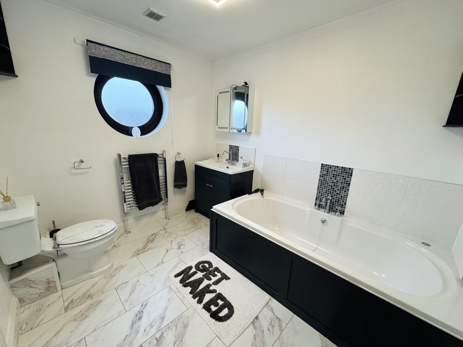 Low level w/c, pedestal wash hand basin, extractor fan, radiator