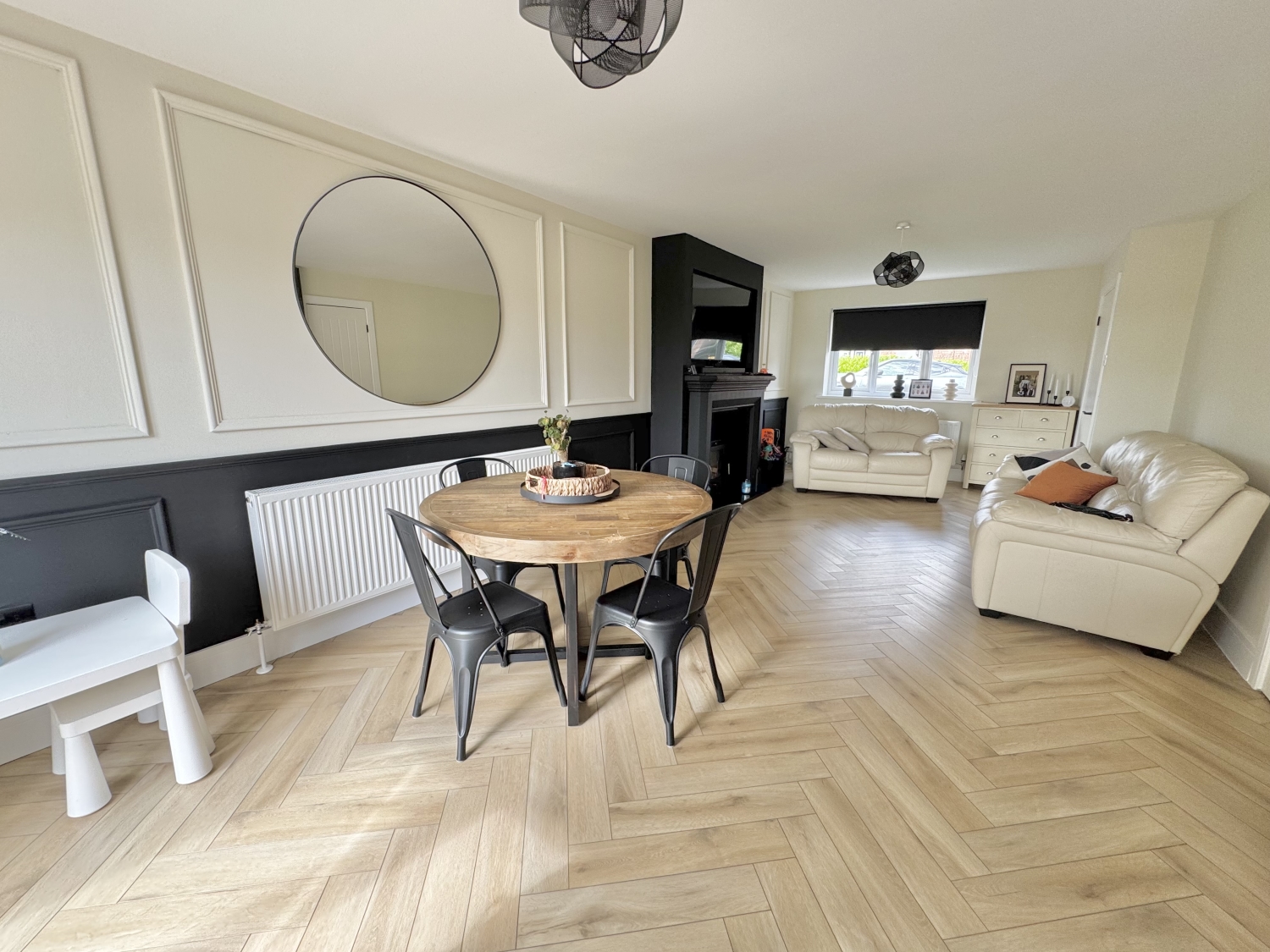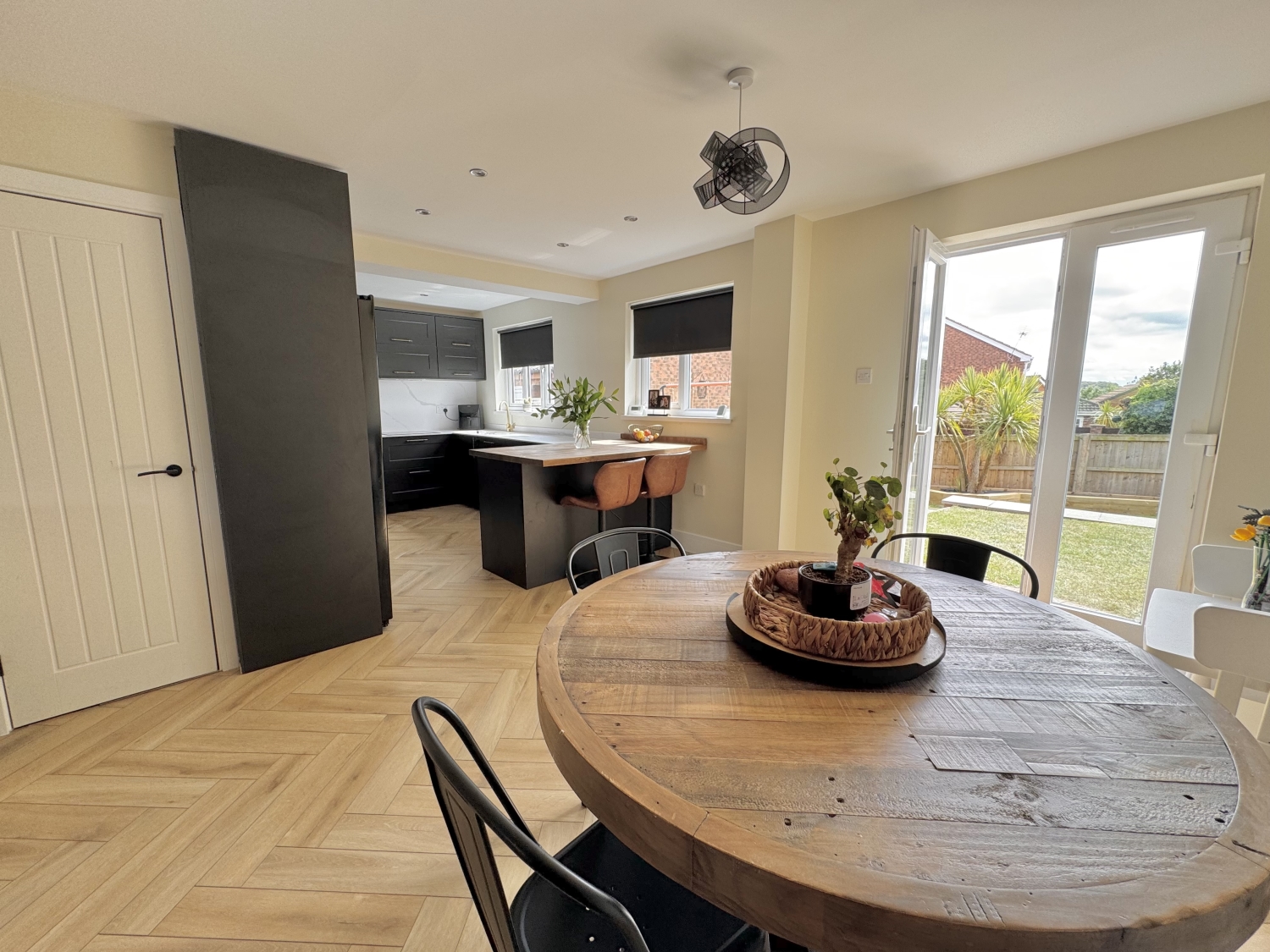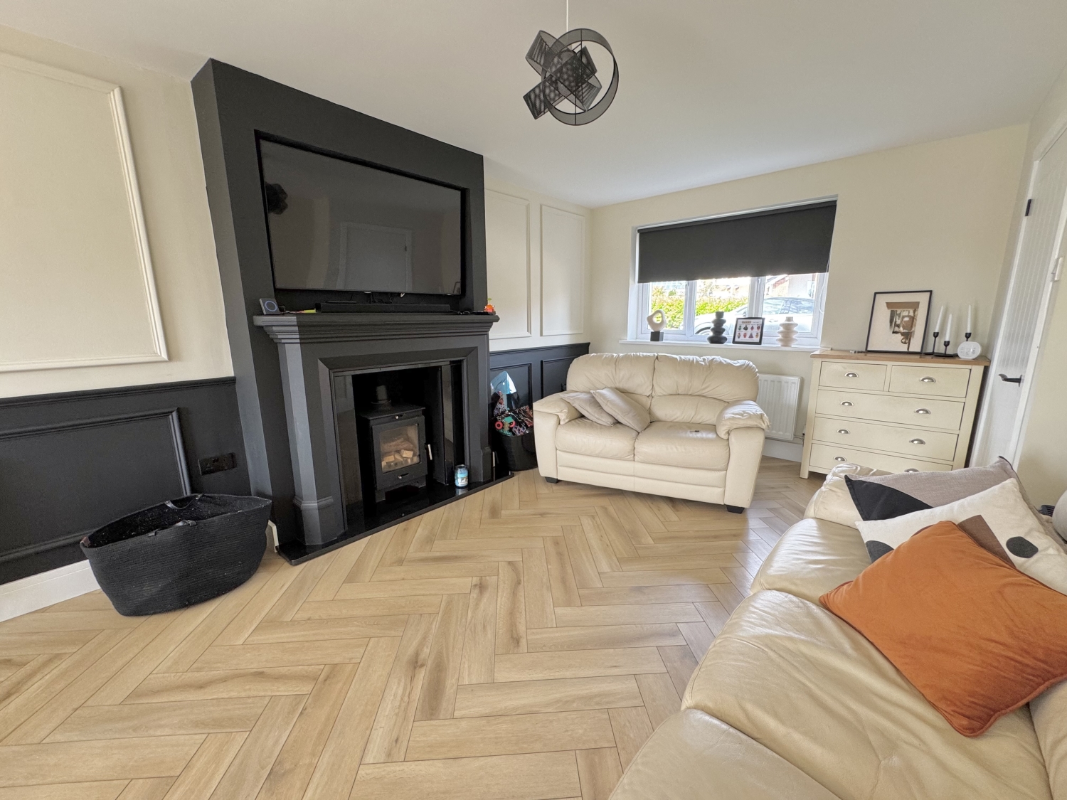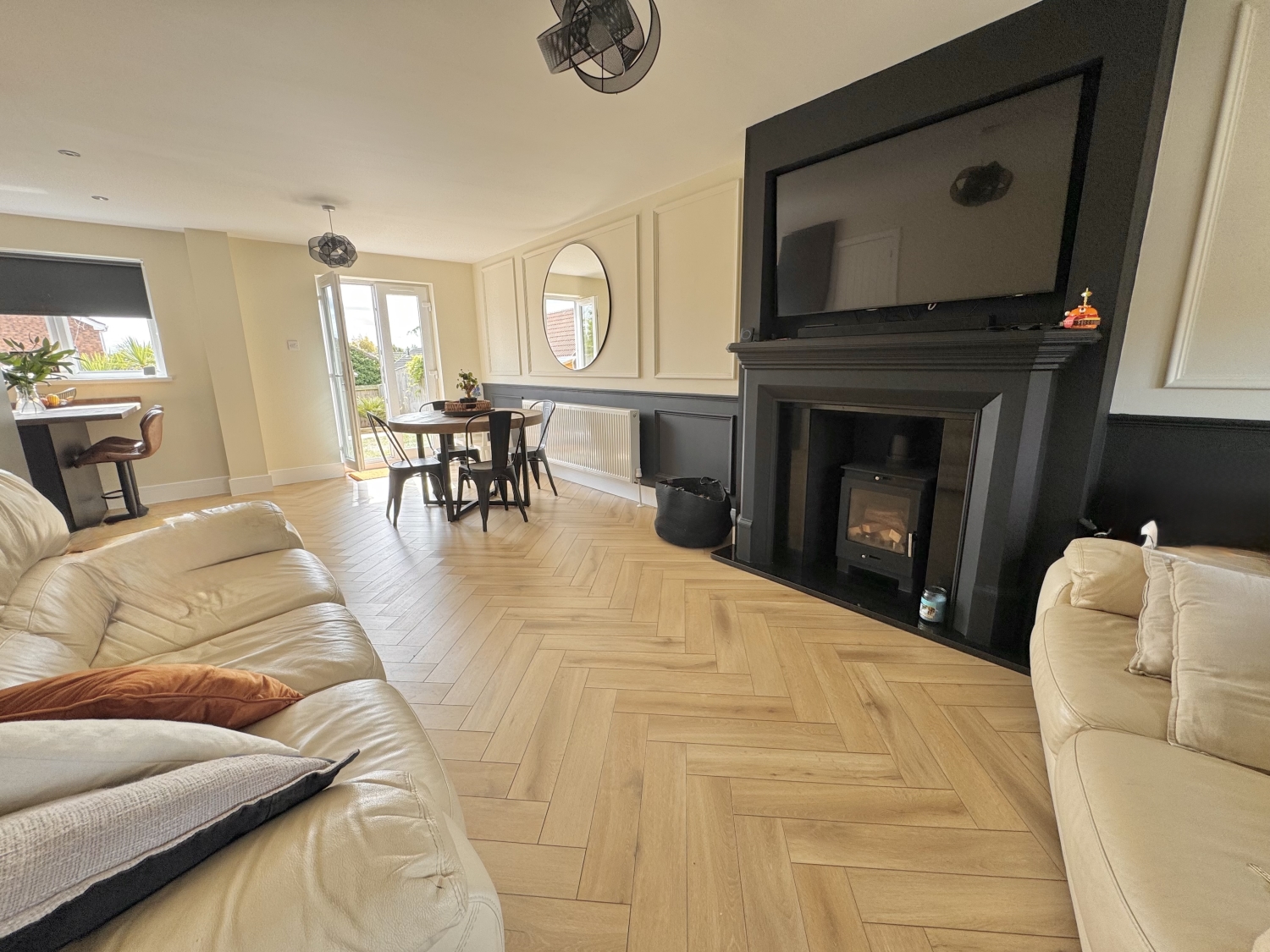 Step into an inviting entrance vestibule that leads into a welcoming hallway, with internal access to the integrated garage. The heart of the home is the impressive open-plan living, kitchen, and dining area—perfect for modern family living and entertaining. This space boasts decorative flooring, log burner, a well-appointed kitchen with a breakfast bar, and French doors that open out to the enclosed rear garden, creating a seamless indoor-outdoor feel.