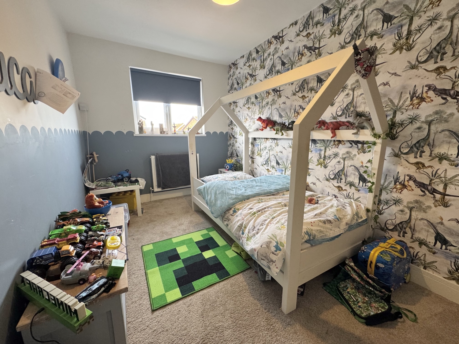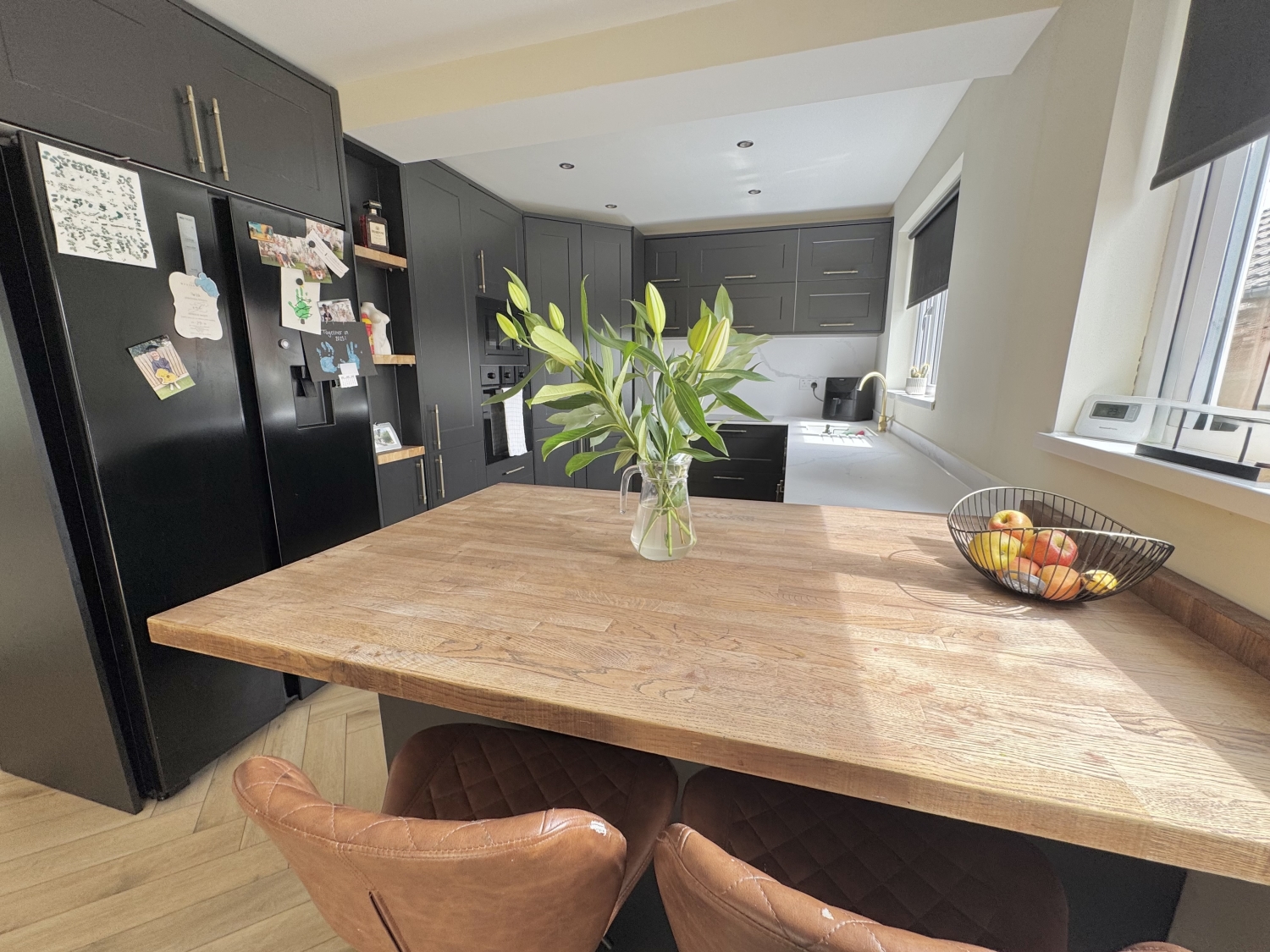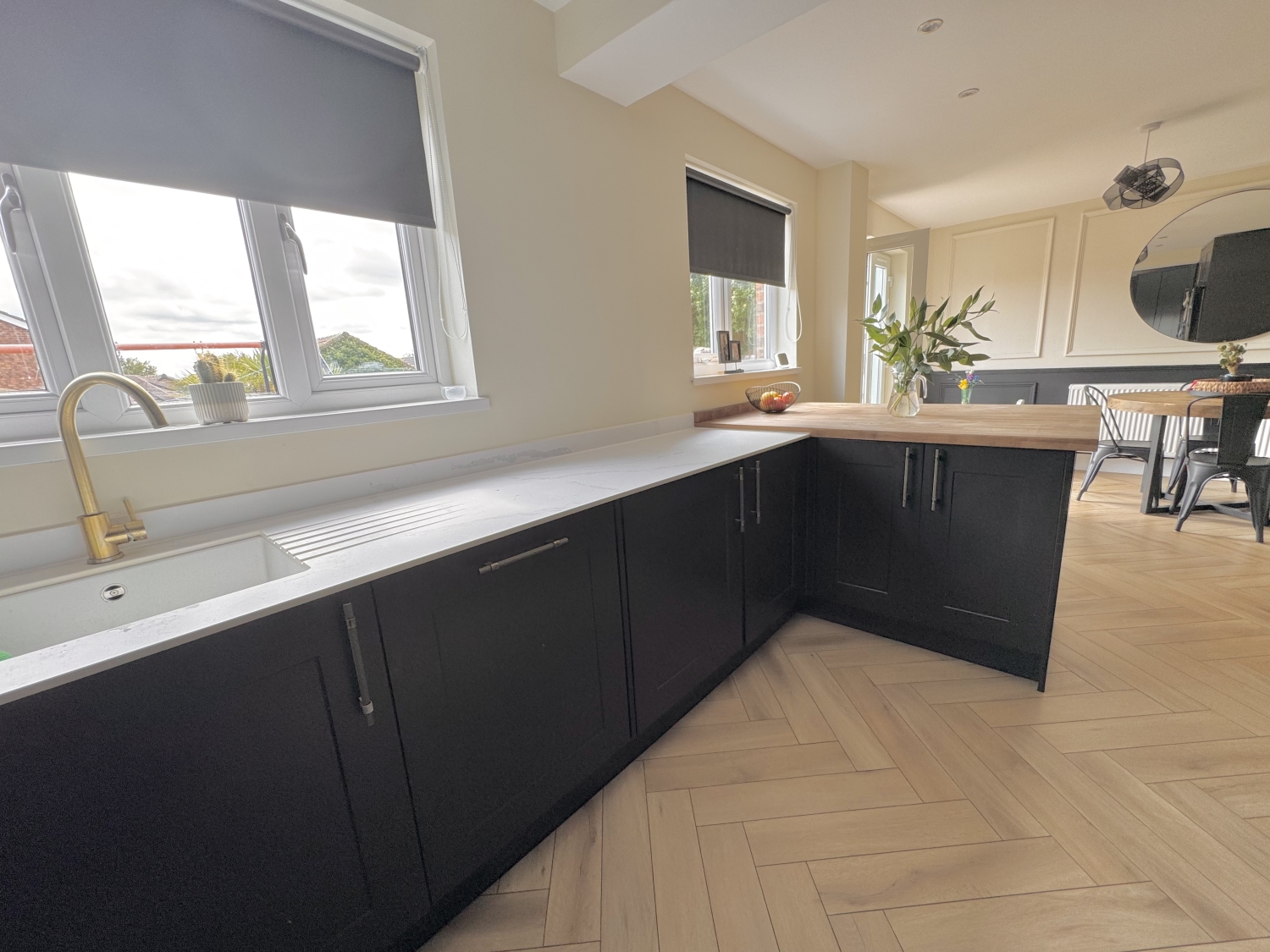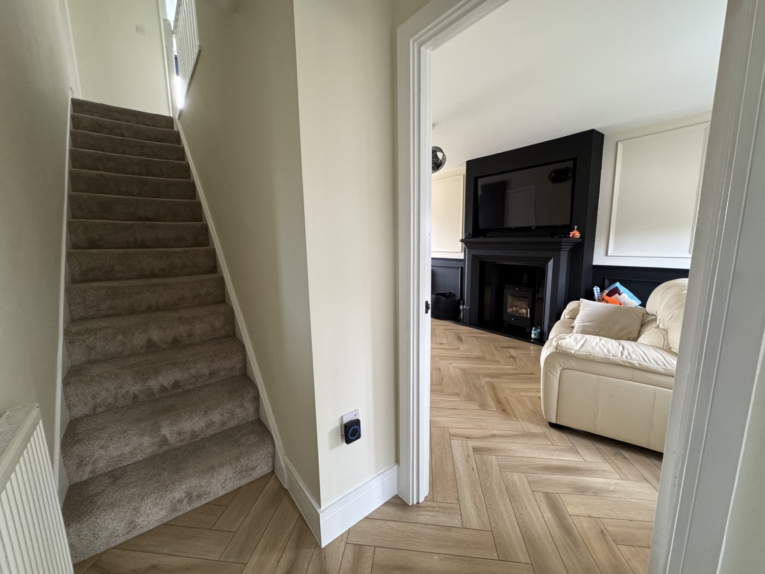 Step into an inviting entrance vestibule that leads into a welcoming hallway, with internal access to the integrated garage. The heart of the home is the impressive open-plan living, kitchen, and dining area—perfect for modern family living and entertaining. This space boasts decorative flooring, log burner, a well-appointed kitchen with a breakfast bar, and French doors that open out to the enclosed rear garden, creating a seamless indoor-outdoor feel.
