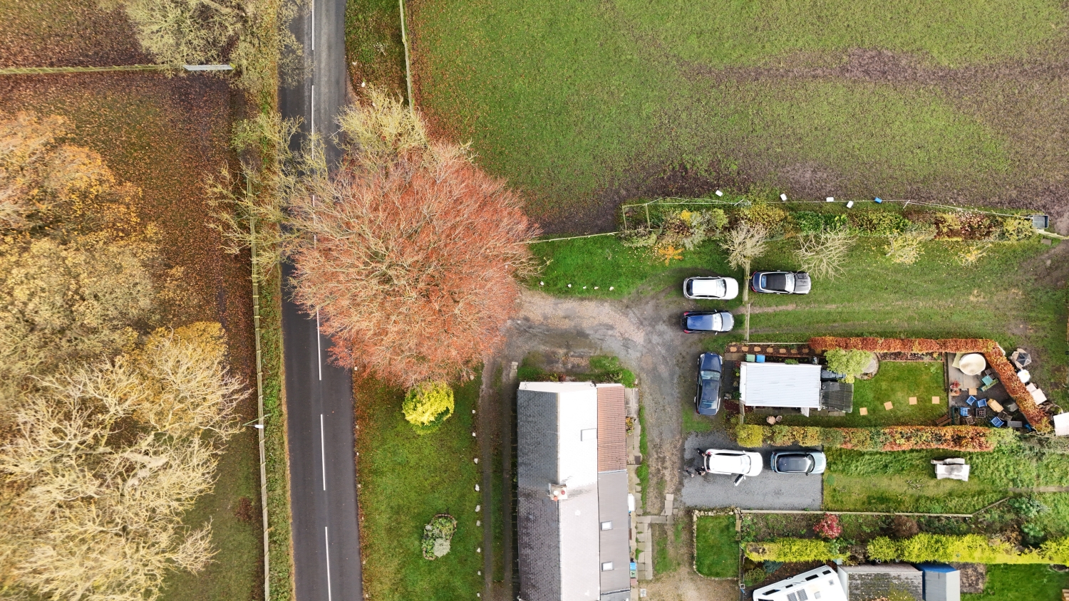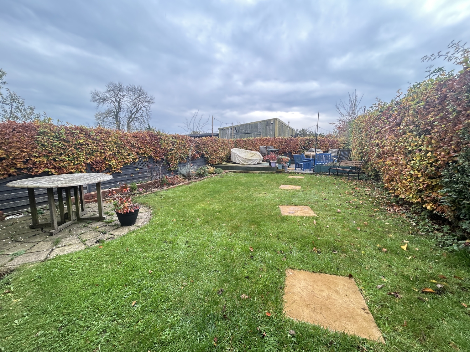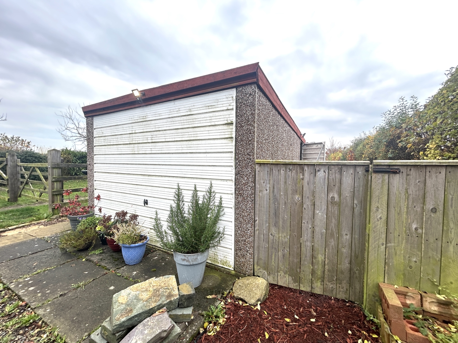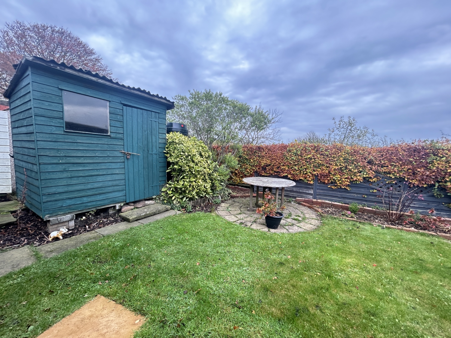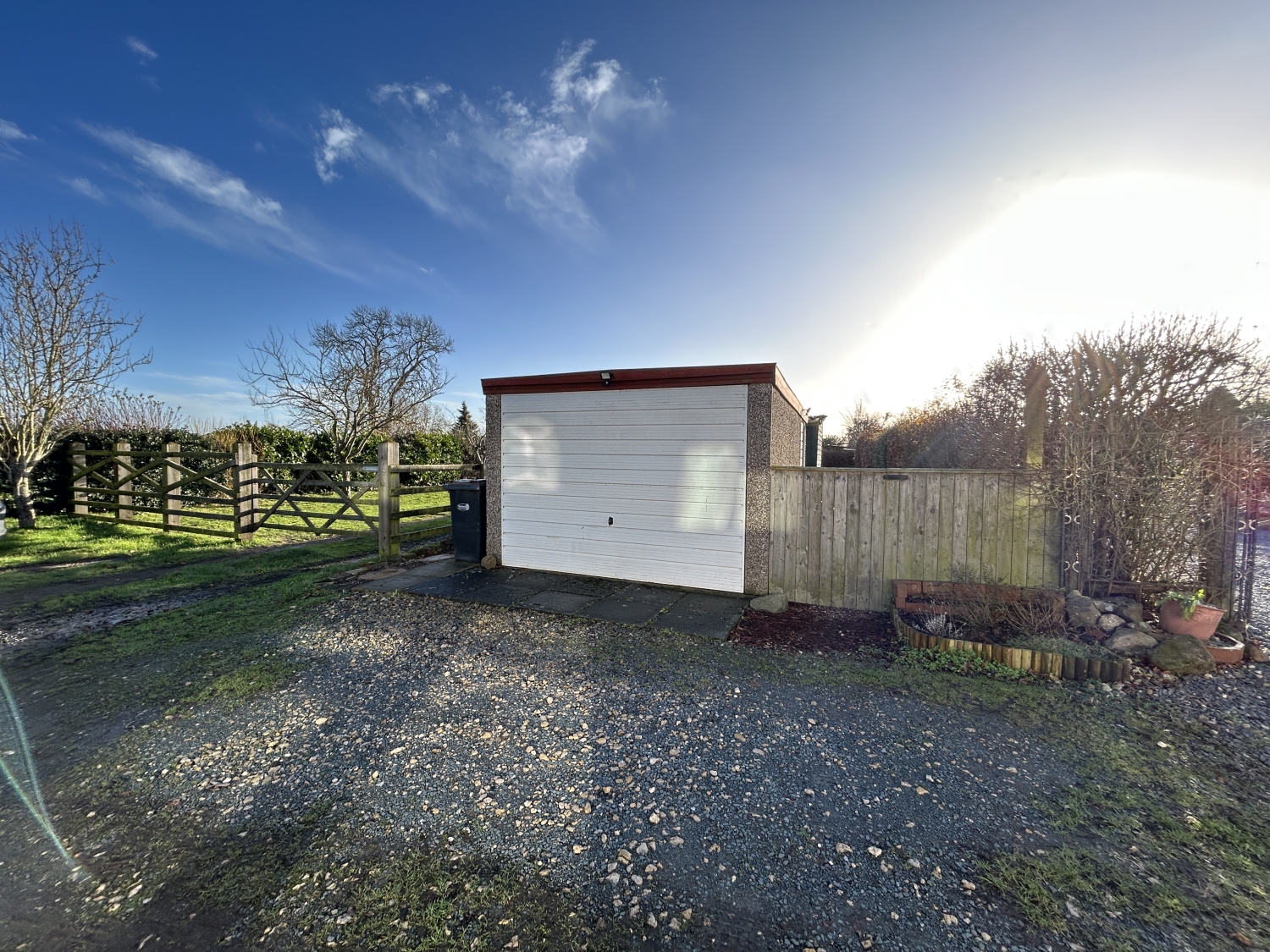 Outside, the open-plan front garden enjoys views over surrounding greenery, while the rear of the property features a detached garage, parking area, and a generous lawned garden with a garden shed—perfect for outdoor relaxation or gardening enthusiasts.
