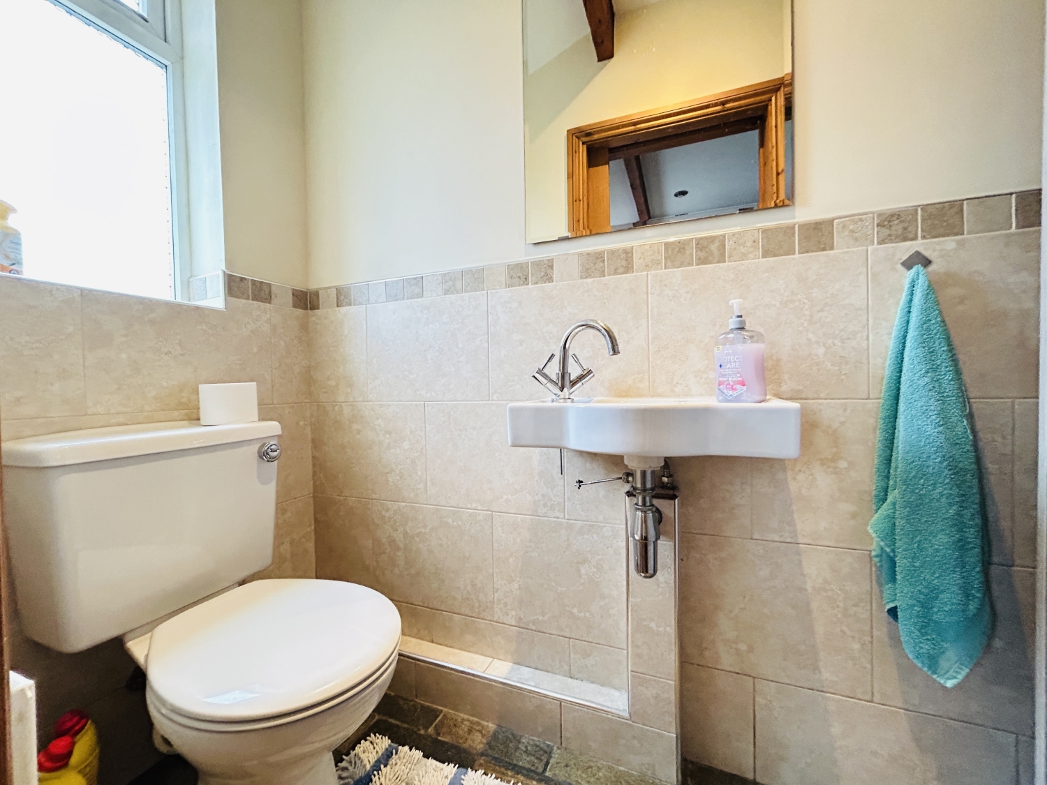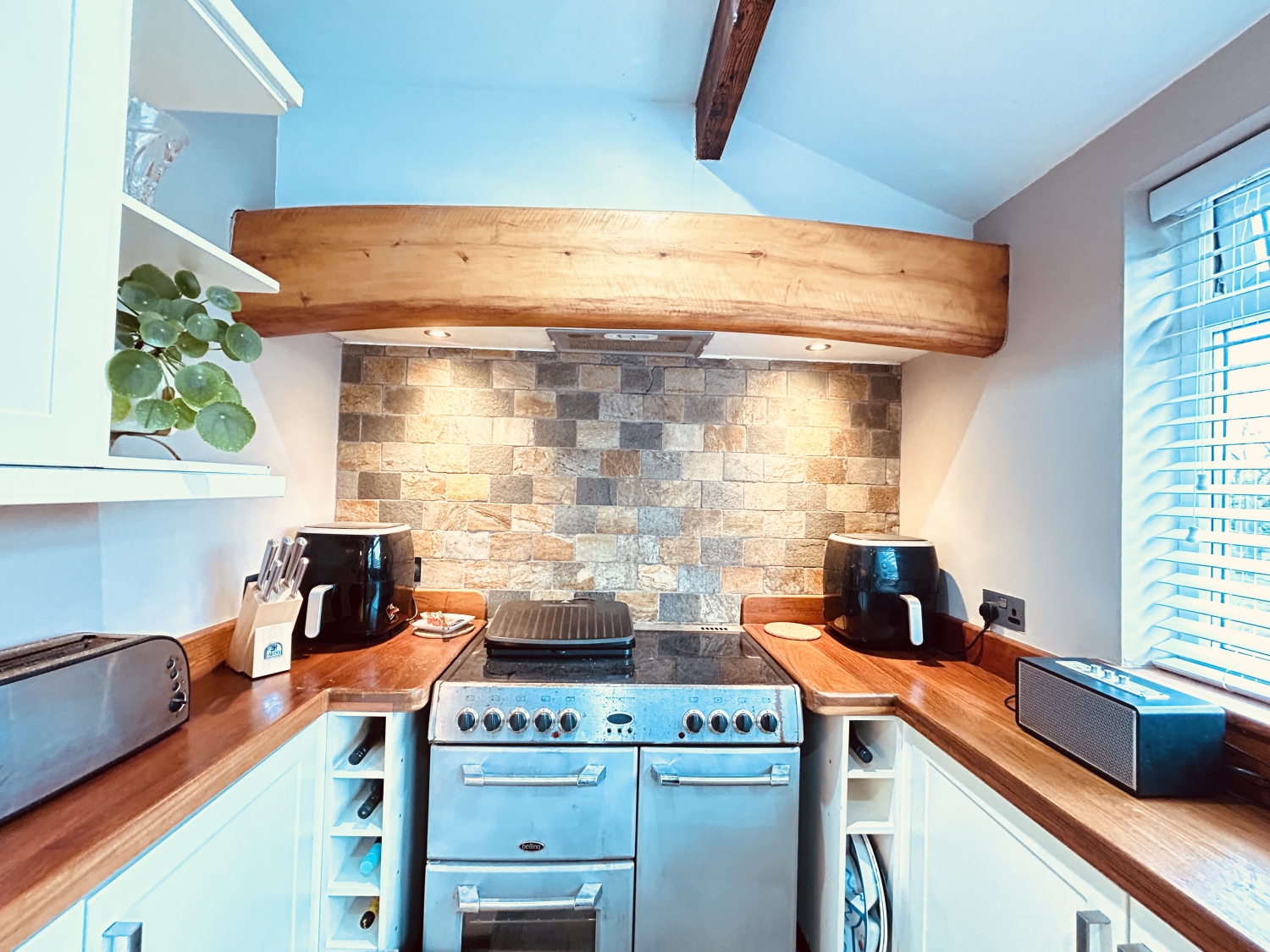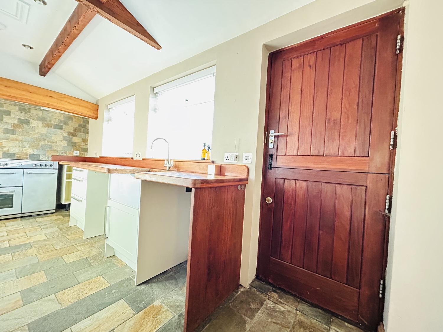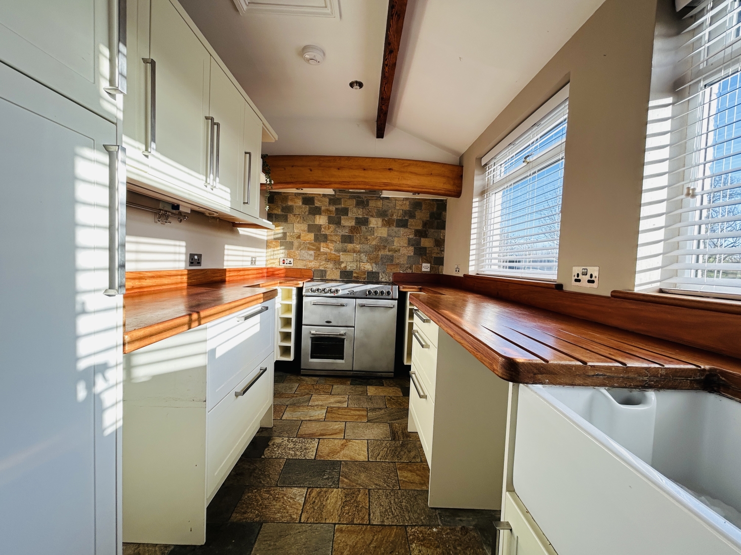 The fabulous kitchen is thoughtfully designed for both functionality and charm, featuring solid wood worktops, ample storage units, a ceramic sunken Belfast sink, and a double oven cooking range—ideal for those who love to cook and entertain. Convenient ground floor cloaks/WC.