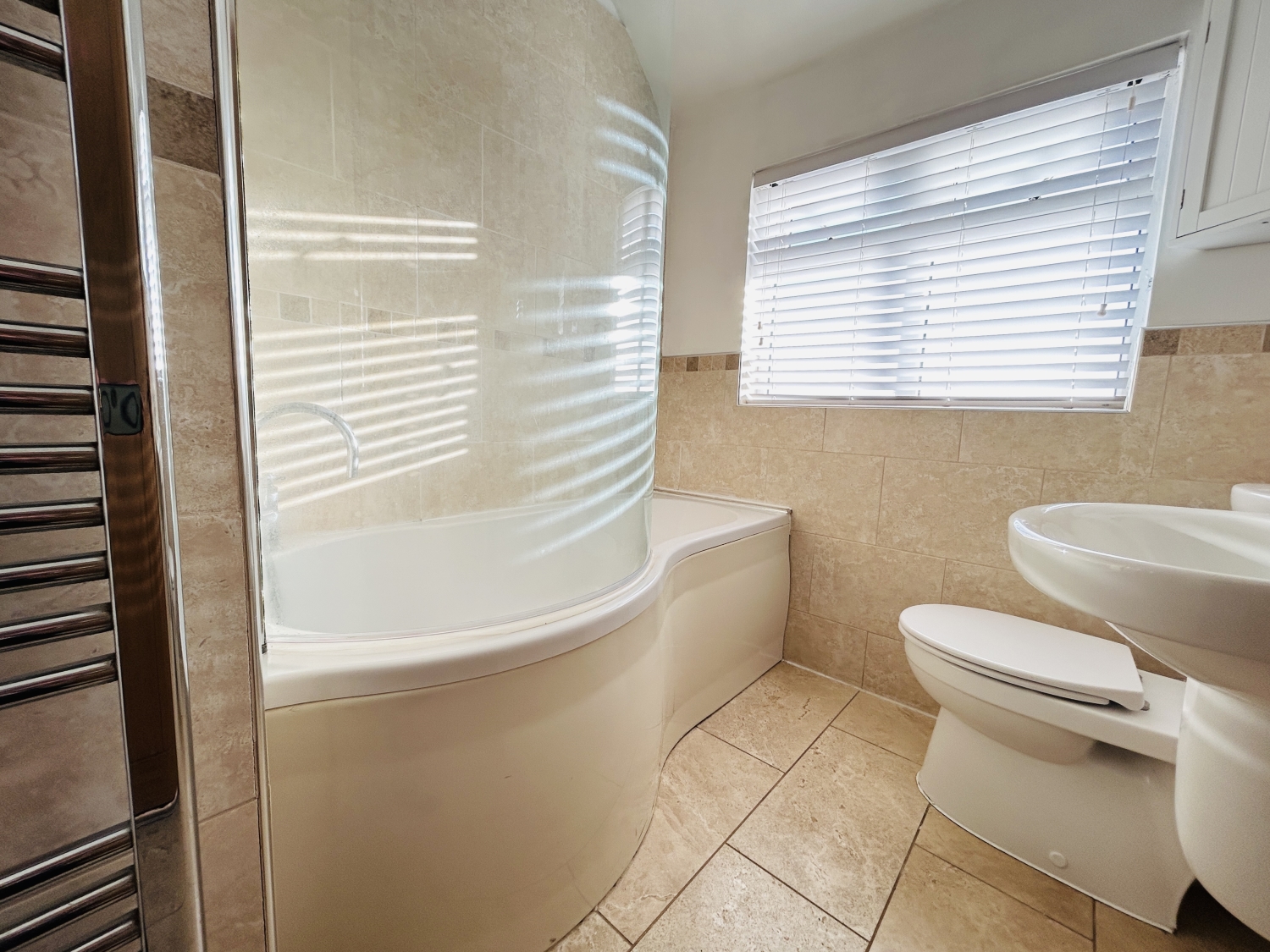 Upstairs, the pleasant landing leads to three well-sized bedrooms, including two doubles and a generously proportioned single. The family bathroom completes the first floor, offering a shower over bath, tiled flooring, and walls for a clean, modern finish.