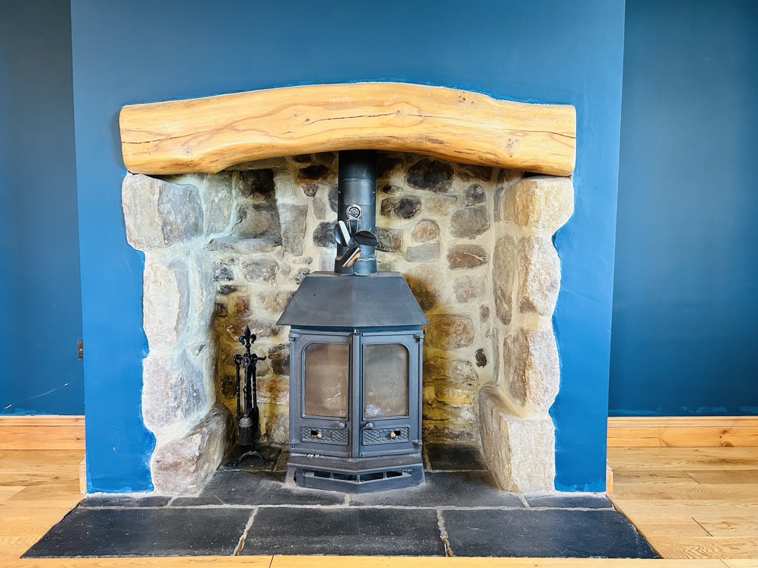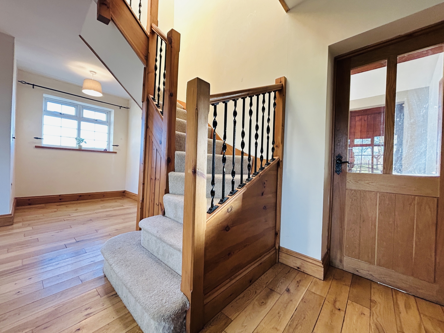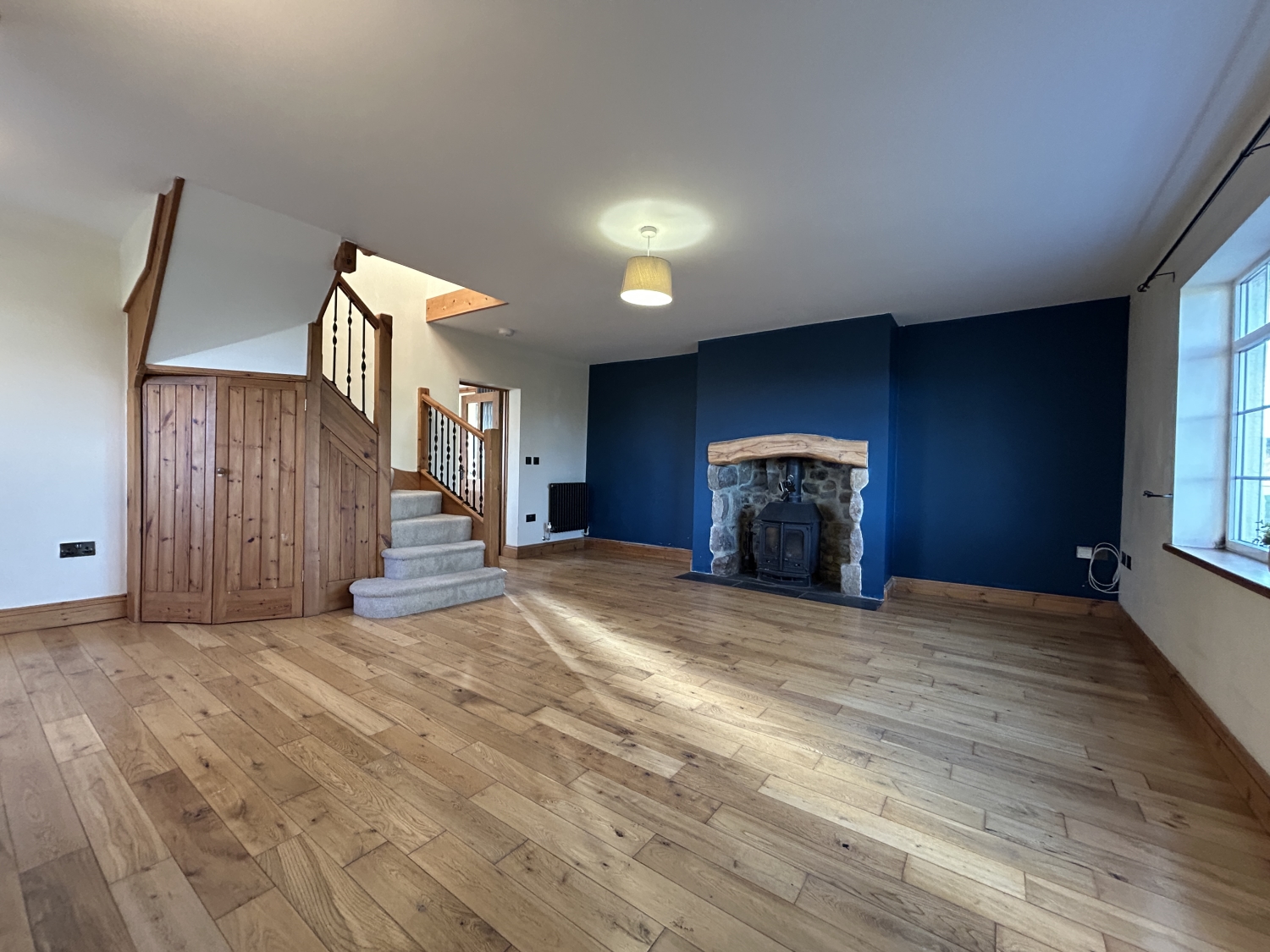 Step into a welcoming hallway with a spacious storage cupboard, leading into a delightful open-plan lounge and dining area. A stylish returned wood staircase adds character, while a feature log-burning stove is beautifully inset into a stone fireplace with plinth, creating a cosy focal point.