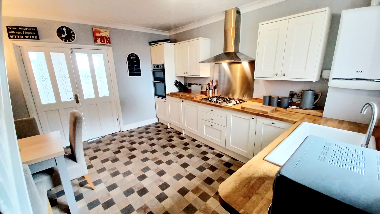 Fitted with a good range of modern base and wall units finished in cream, wooden worktops, sink unit with stainless steel mixer tap, integrated double oven with hob and chimney extractor hood, integrated dishwasher and washing machine, stairs accessing the first floor, integrated fridge and freezer, upvc framed double glazed window, radiator, lino flooring, space for dining table and chairs, door leading into:-