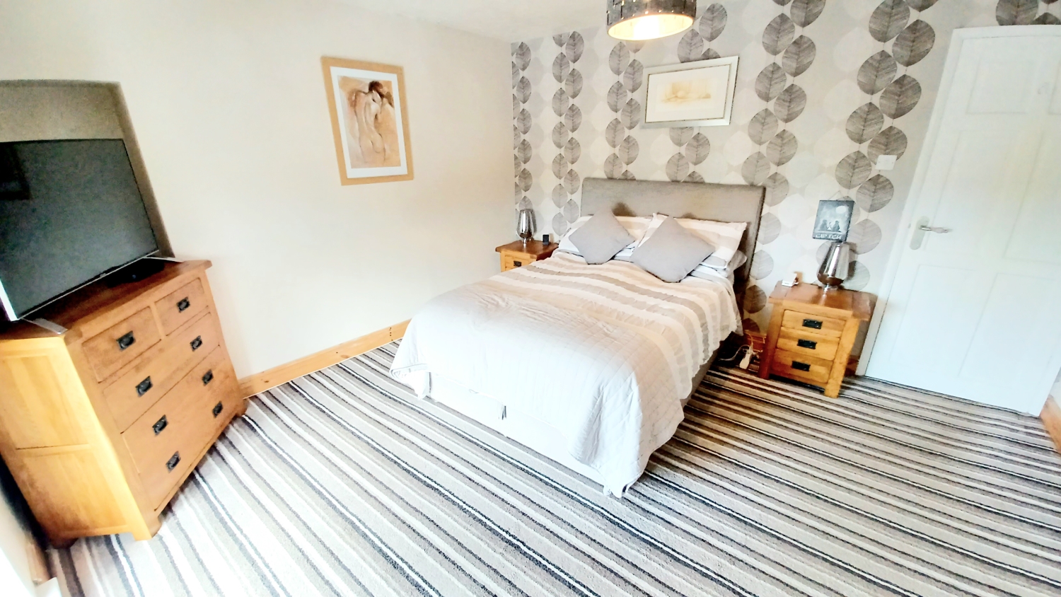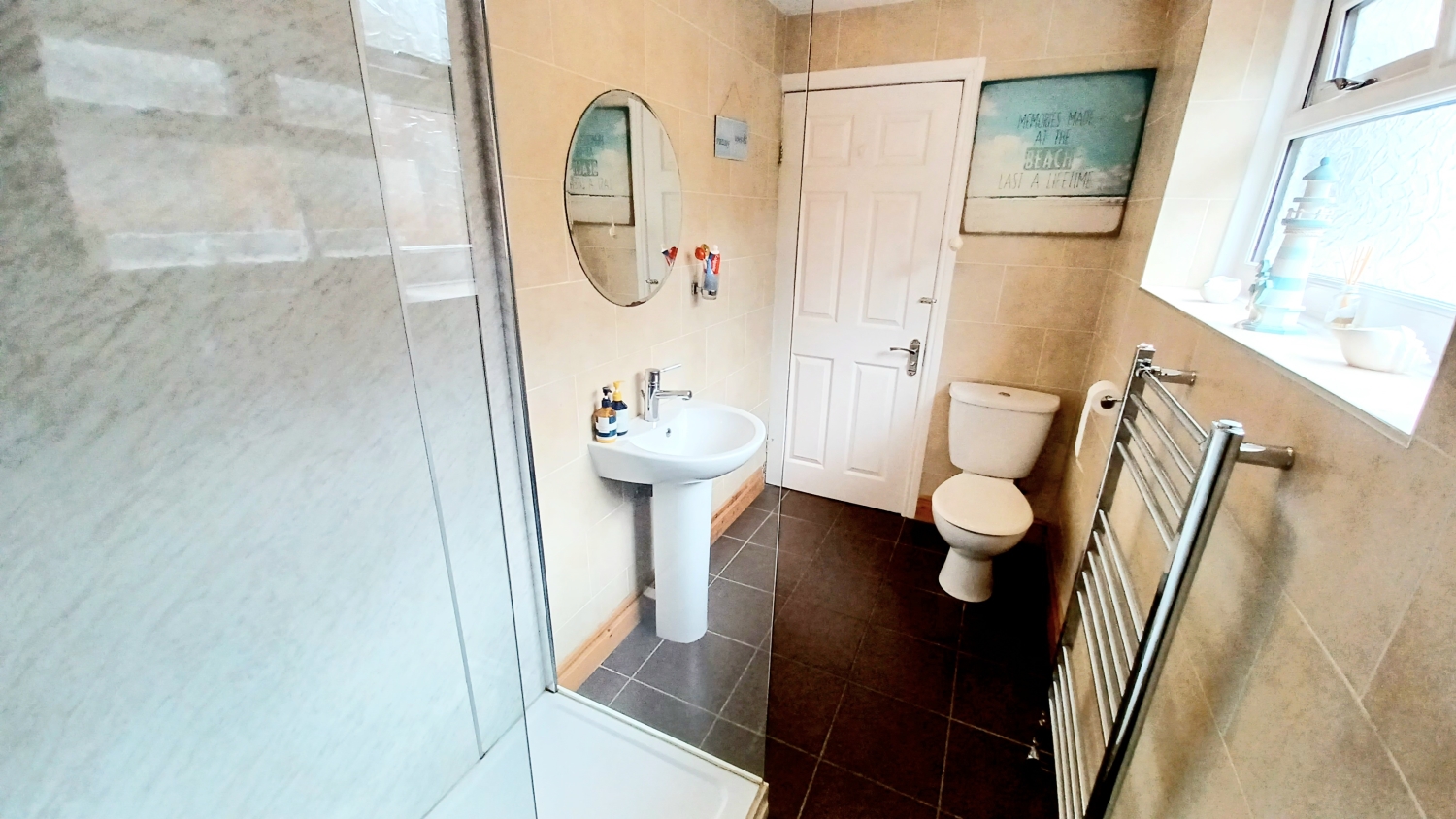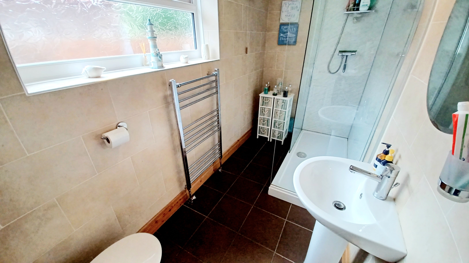 Fitted with a well appointed 3 piece suite comprising a corner shower cubicle with overhead shower, pedestal handwash basin, low level WC, tiling to the walls heated towel rail, tiled flooring, upvc framed double glazed window, extractor.