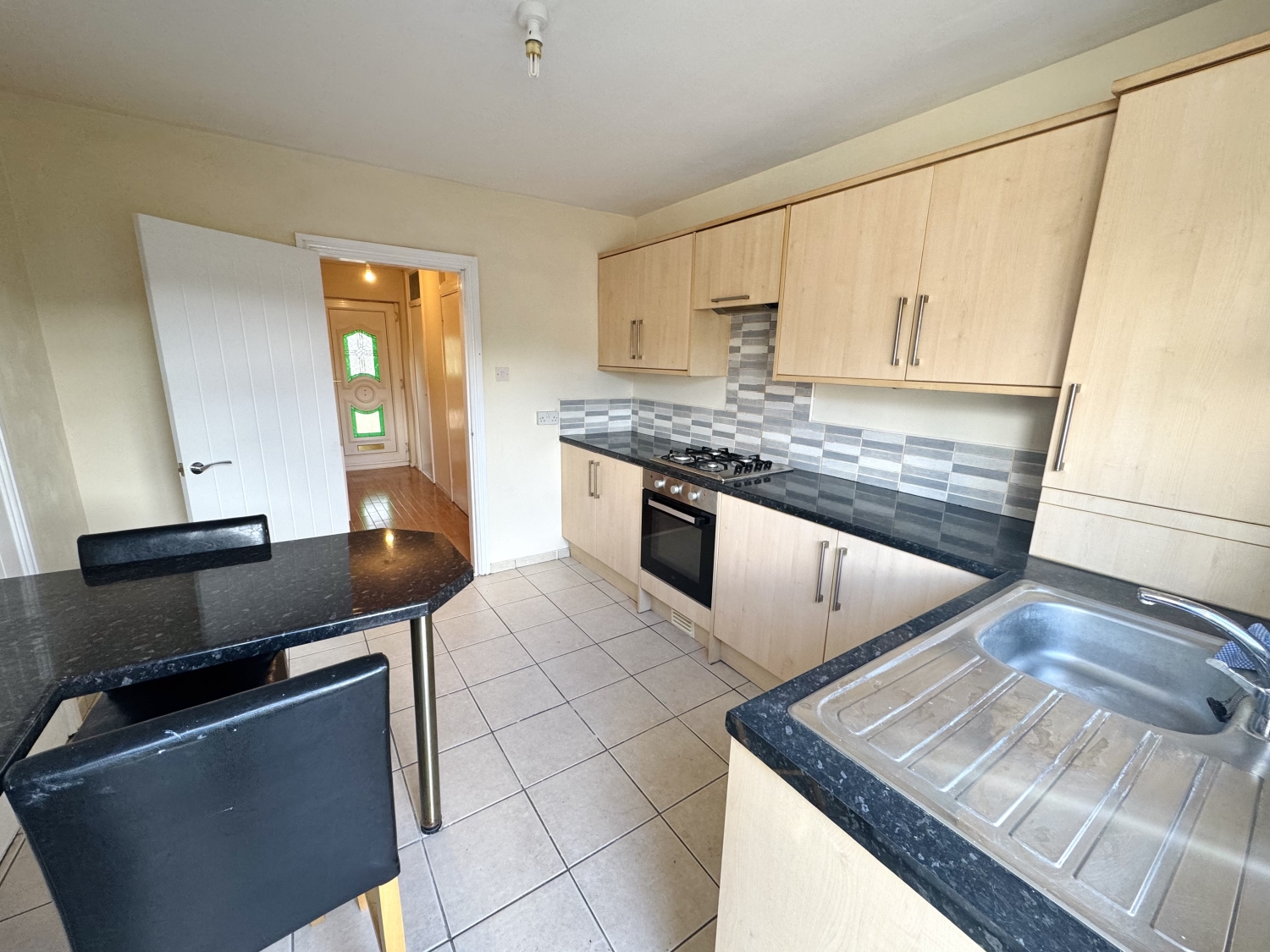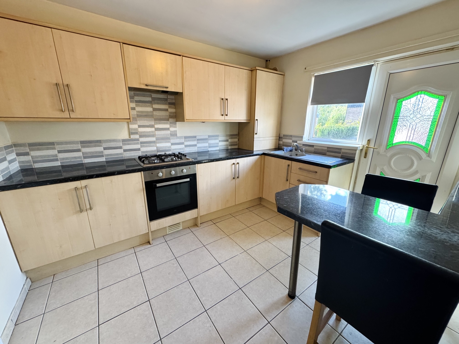 Fitted with a range of wall and base units with complementing work surfaces and breakfast bar, gas hob, electric oven, extractor hood, stainless steel sink with drainer and dual tap, space for fridge/freezer, boiler, radiator, tiled flooring, double glazed window to the rear elevation, upvc door to the rear garden