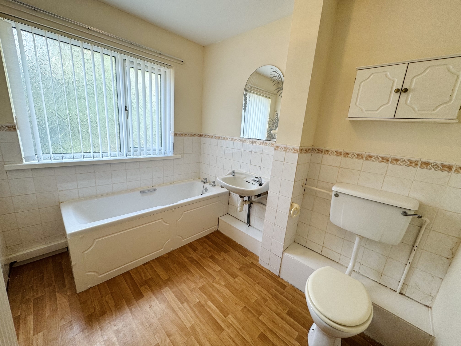 Fitted with a 3 piece suite comprising of; Bath, wash hand basin, low level w/c, radiator, double glazed window to the rear elevation