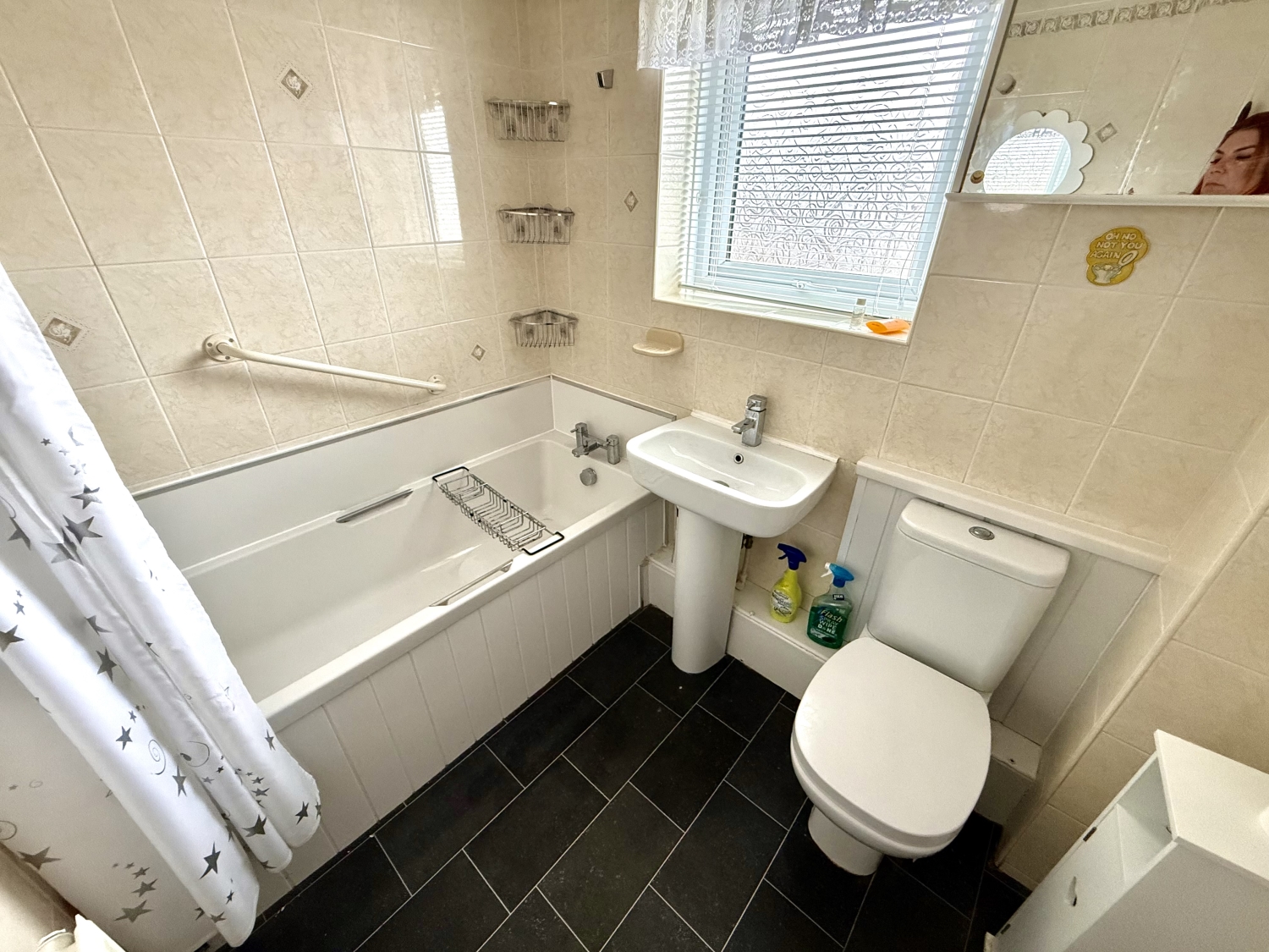 Re-fitted with a white three piece suite with chrome effect fitments comprising a panel bath with Triton shower over, pedestal wash hand basin and low level WC. Double glazed frosted window to the rear, fully tiled walls and single central heating radiator.