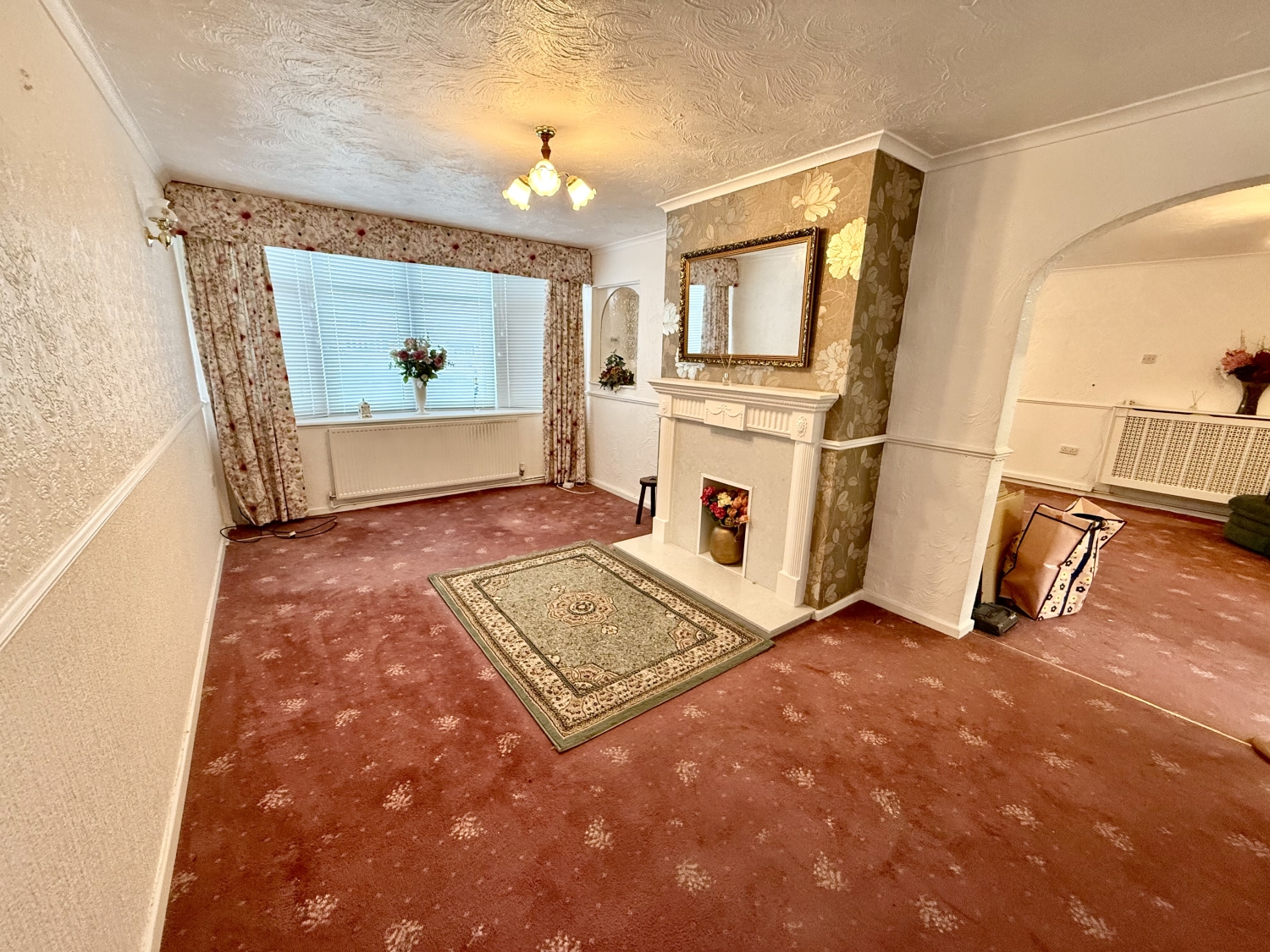 Double glazed bay window to the front, double glazed window to the rear, cove and textured ceiling, single central heating radiator and Adam style feature fire surround, with marble effect hearth and insert.