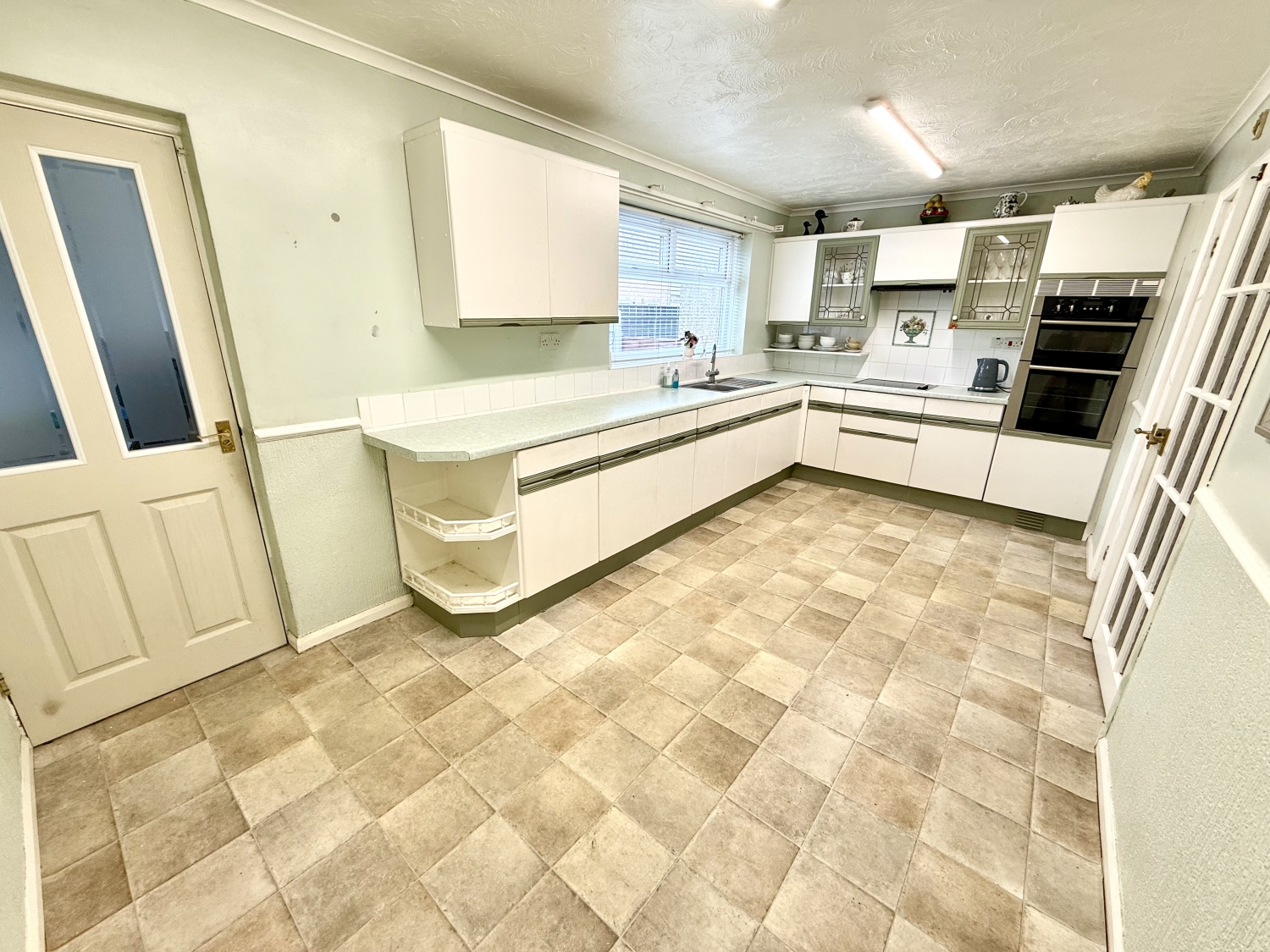 Fitted with a range of wall and base units, having contrasting work surfaces, incorporating a stainless steel sink unit with mixer tap and drainer. Double glazed window to the rear, storage cupboard, splashback tiling, built in double oven, hob and extractor hood and cove and textured ceiling.