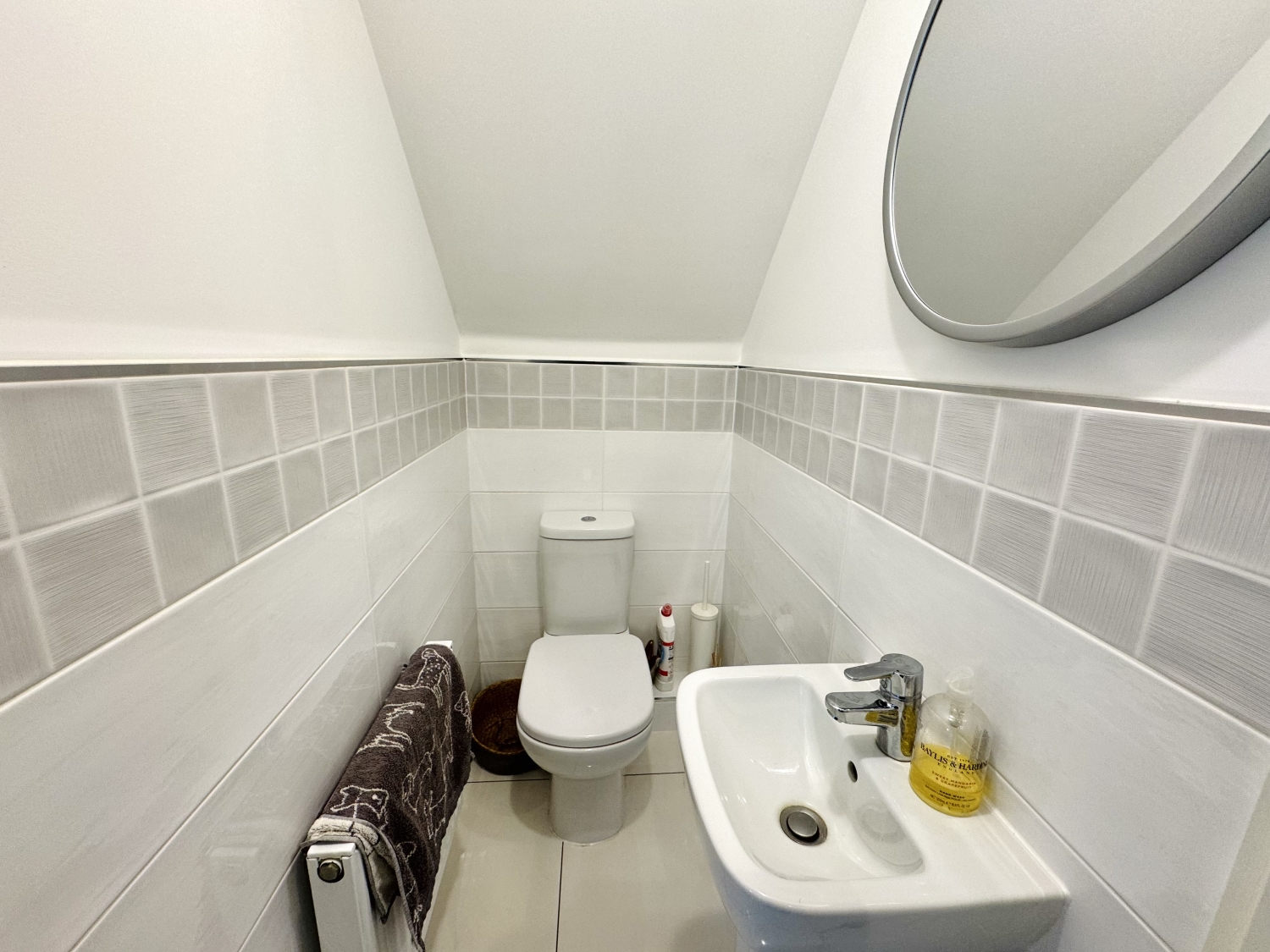 Low level w/c, pedestal wash hand basin, radiator, extractor fan, part tiled walls, tiled flooring