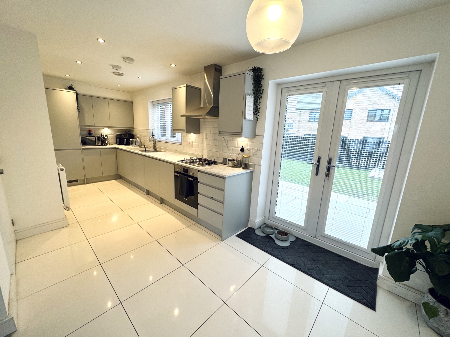 The living room is a warm and stylish space, featuring a contemporary media wall complete with an electric fire, ideal for cosy evenings and relaxed entertaining. This room seamlessly opens into the kitchen/dining area, where a Howdens fitted kitchen awaits with sleek cabinetry and integrated appliances. Patio doors at the rear flood the space with natural light and offer direct access to the rear garden, making it perfect for indoor-outdoor living and summer gatherings.