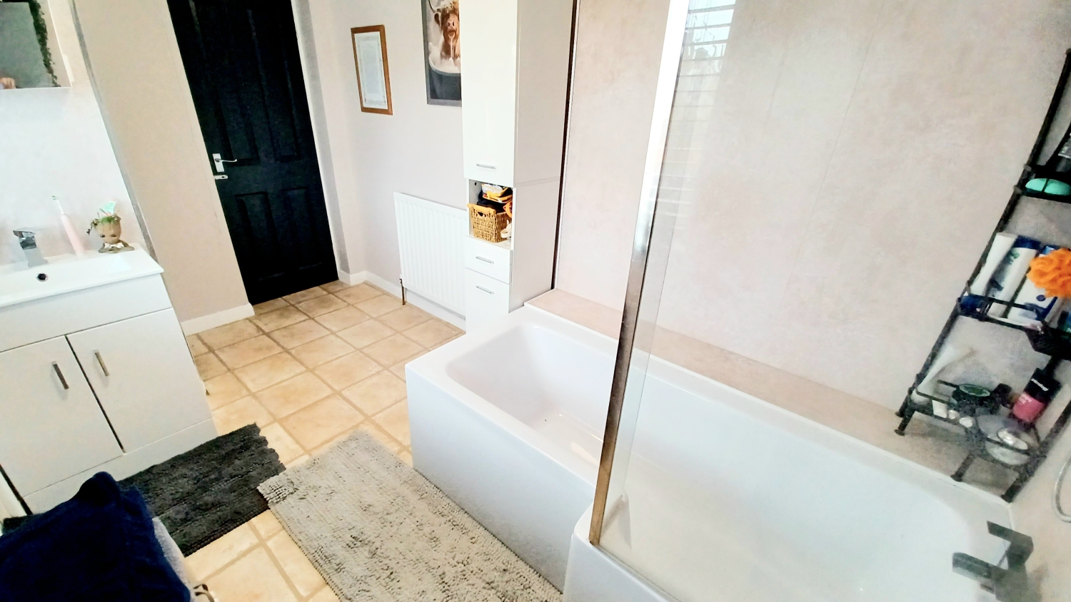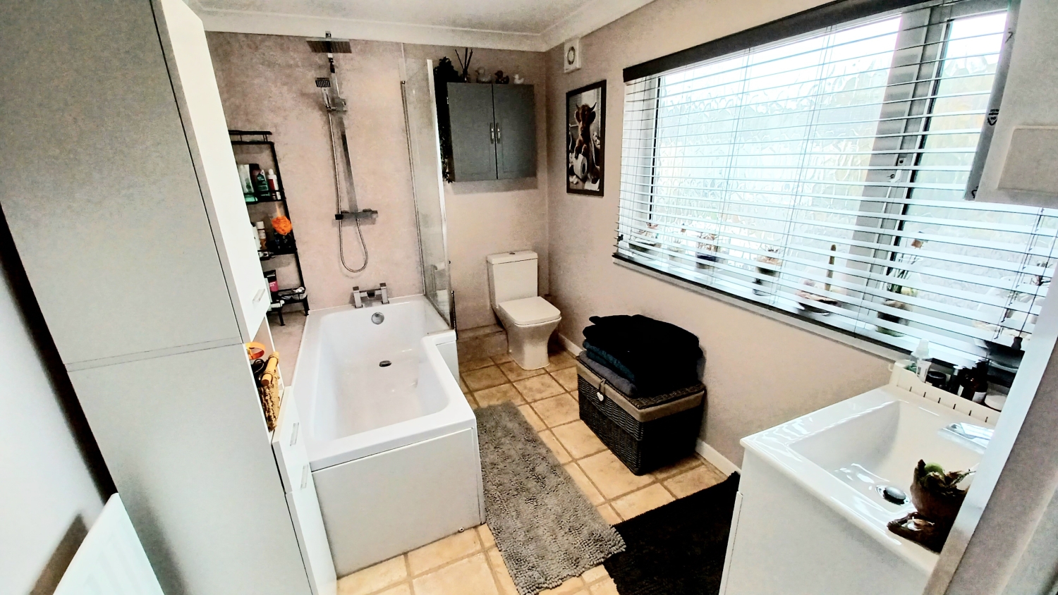 Fitted with a very well appointed 3 piece suite comprising a panel bath with overhead shower and screen, handwash basin inset into vanity unit, low level WC, lino flooring, storage cupboard, upvc framed double glazed window, radiator, extractor.