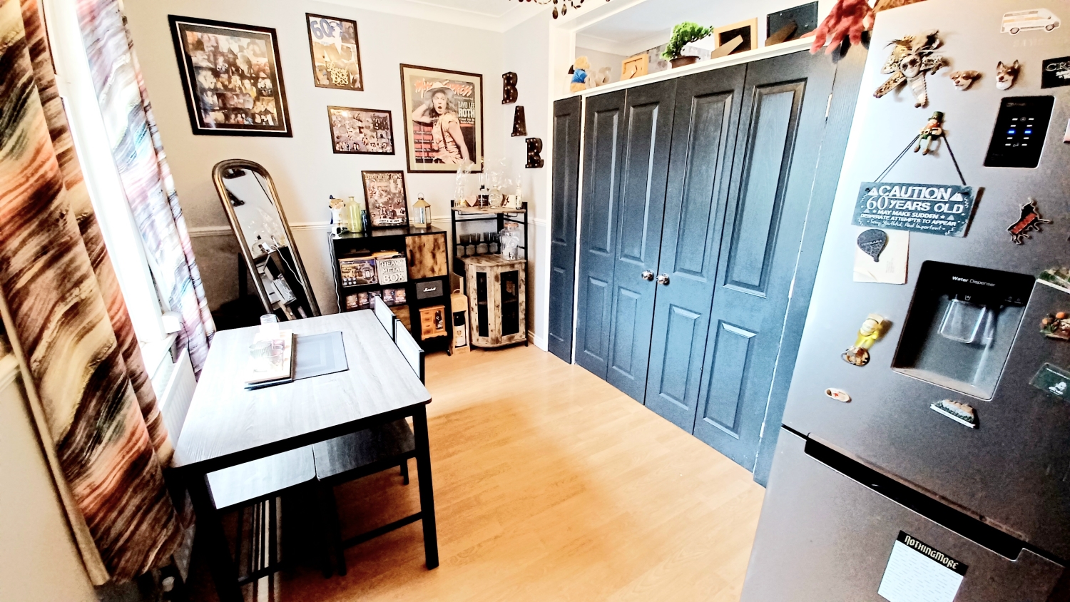 Upvc framed double glazed window, radiator, laminate flooring, ample room for dining table and chairs, understairs storage cupboard, door leading into:-