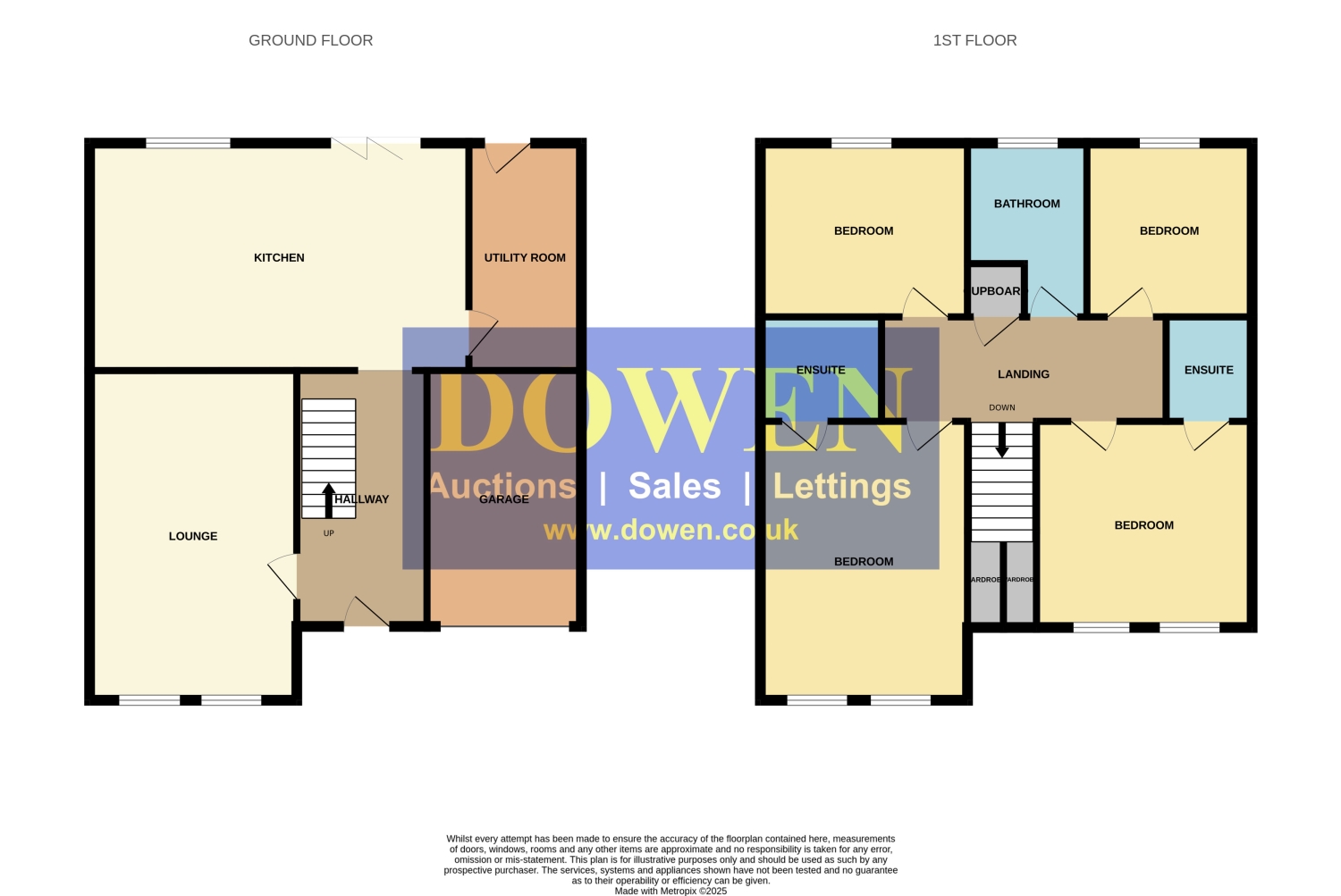 Upstairs, four generously sized bedrooms include two with en-suite bathrooms, offering comfort and convenience for family living or hosting guests. A third bathroom serves the remaining rooms, completing the well-designed layout.