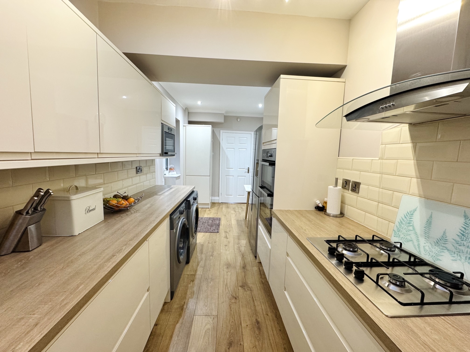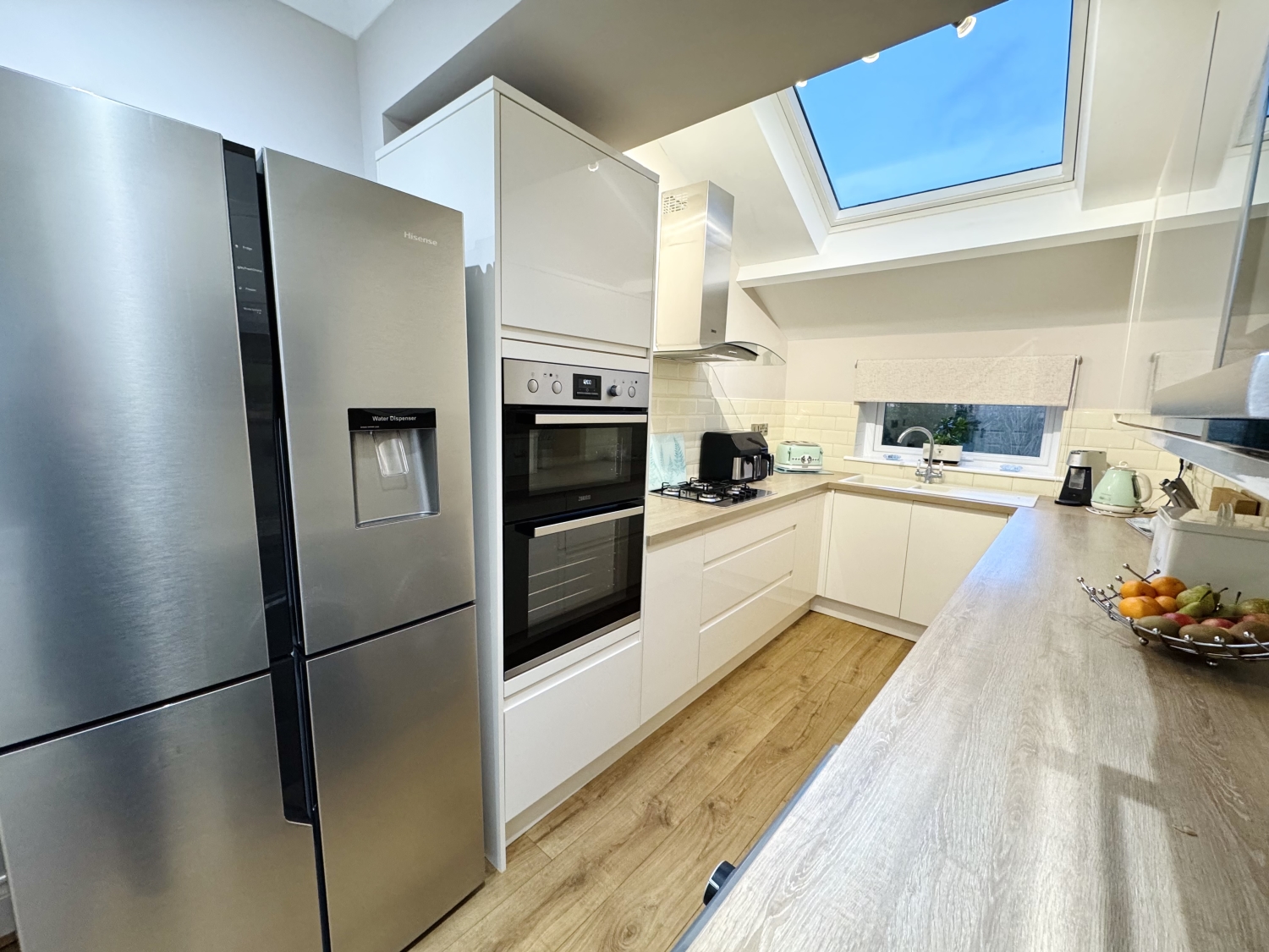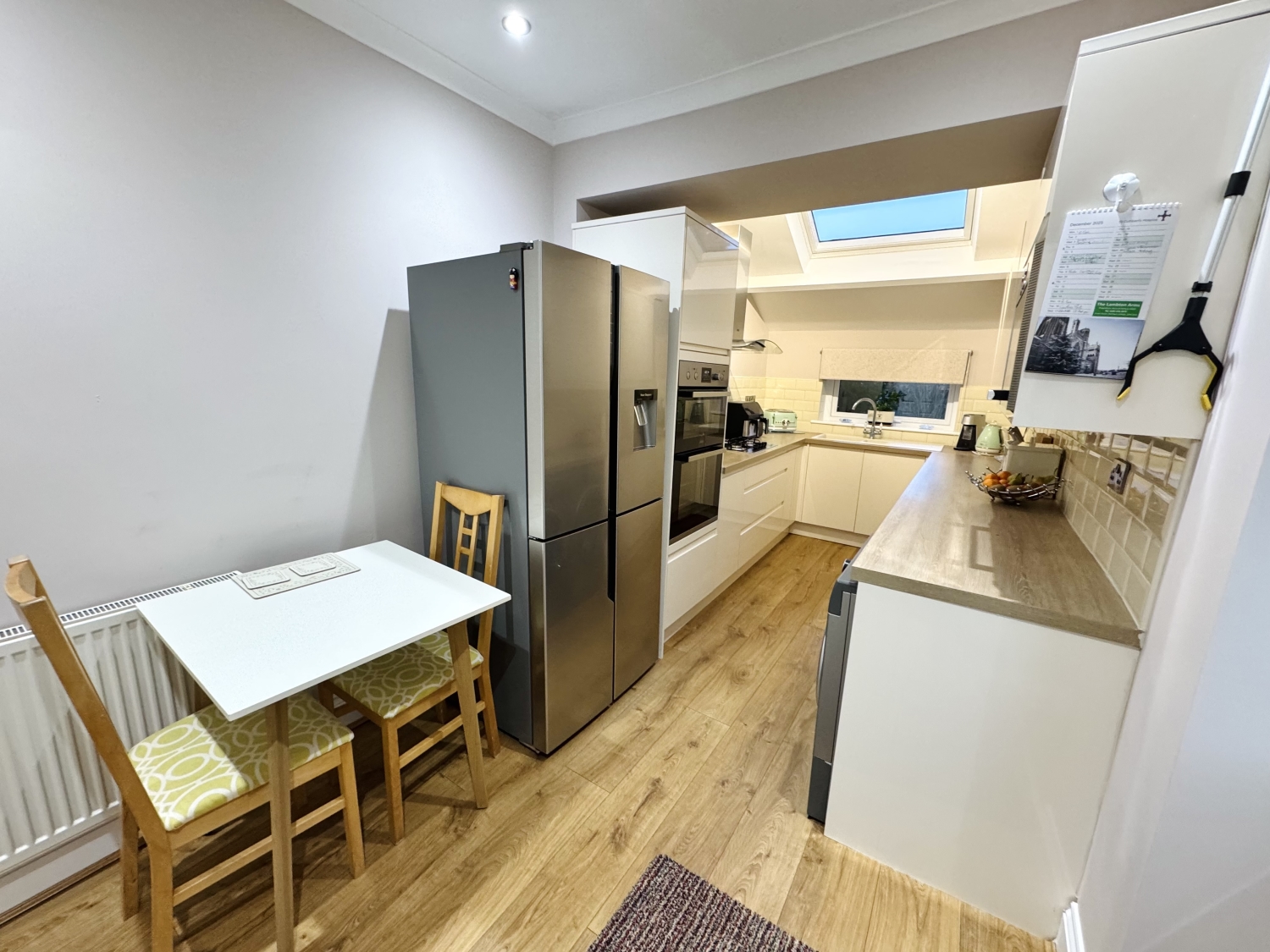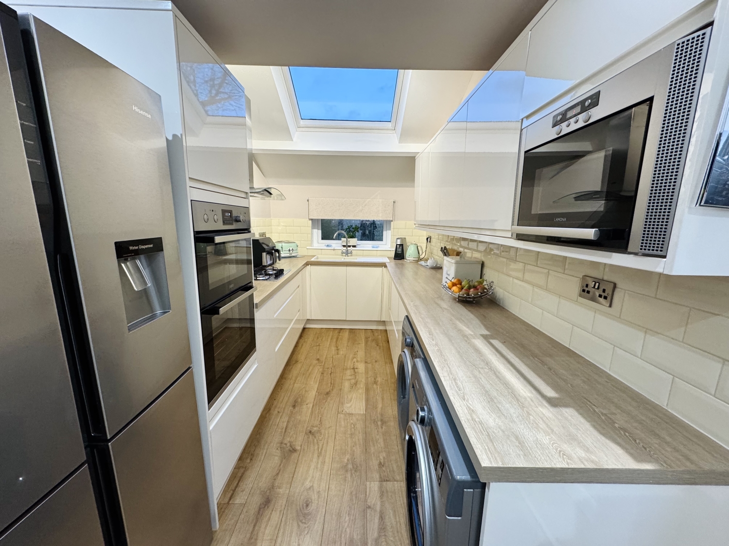 Fitted with a range of Howdens wall and base units with complementing work surfaces, splash back tiling, Gas hob, Zanussi extractor hood, Zanussi electric double oven, integrated dishwasher, integrated combination oven, composite sink with drainer and mixer tap, boiler, space for fridge/freezer, space for washing machine, space for dryer, radiator, spotlights and coving to ceiling, double glazed sky light, double glazed windows to the side and rear elevation, upvc door to the side elevation