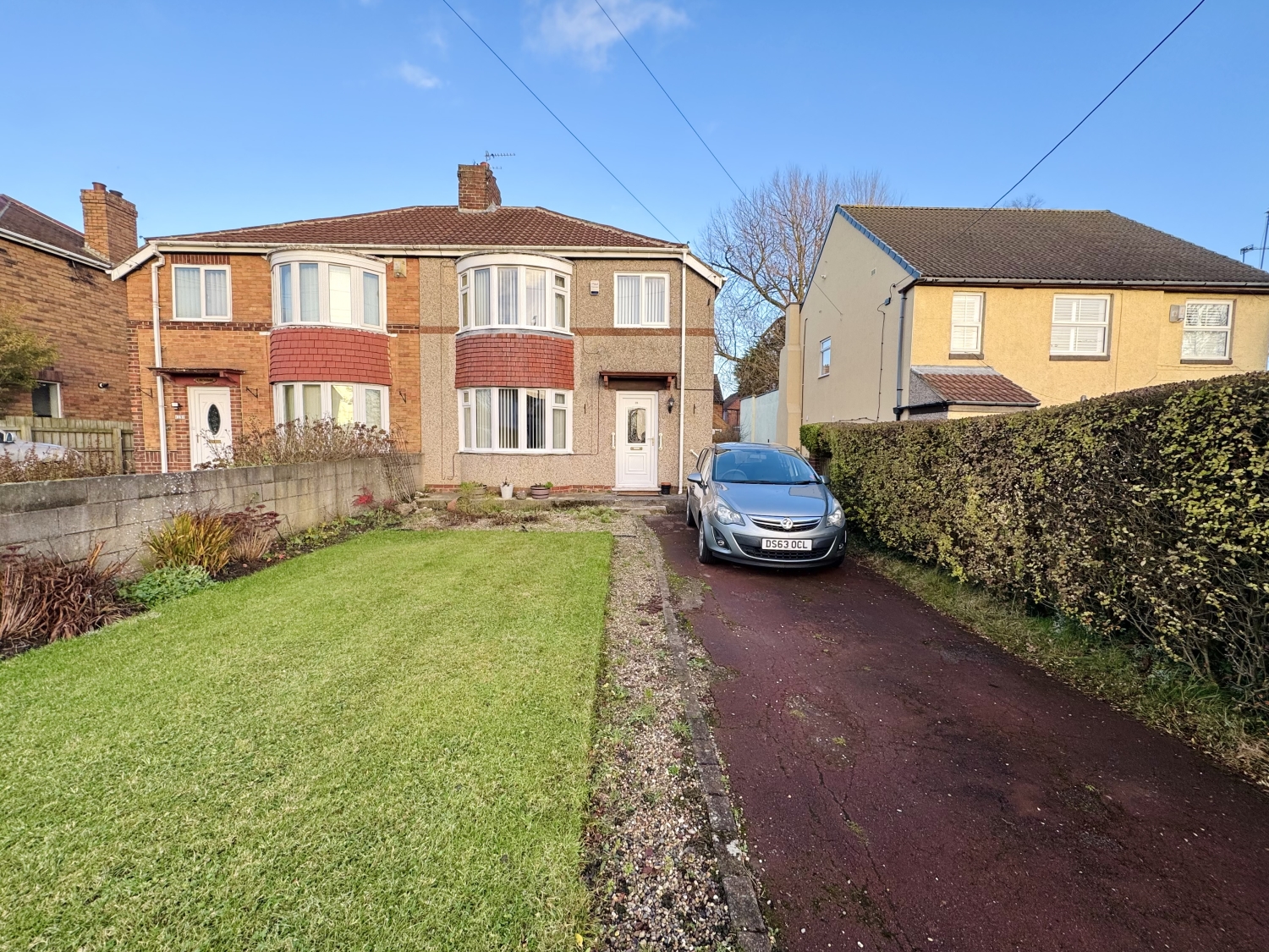 To the front, a neatly laid to lawn garden sits alongside a driveway with space for two cars, creating a welcoming approach. Stepping inside, you are greeted by a spacious 13ft entrance hallway with a side elevation window that fills the space with natural light. From here, stairs lead to the first-floor landing, and there is convenient access to a downstairs W/C.