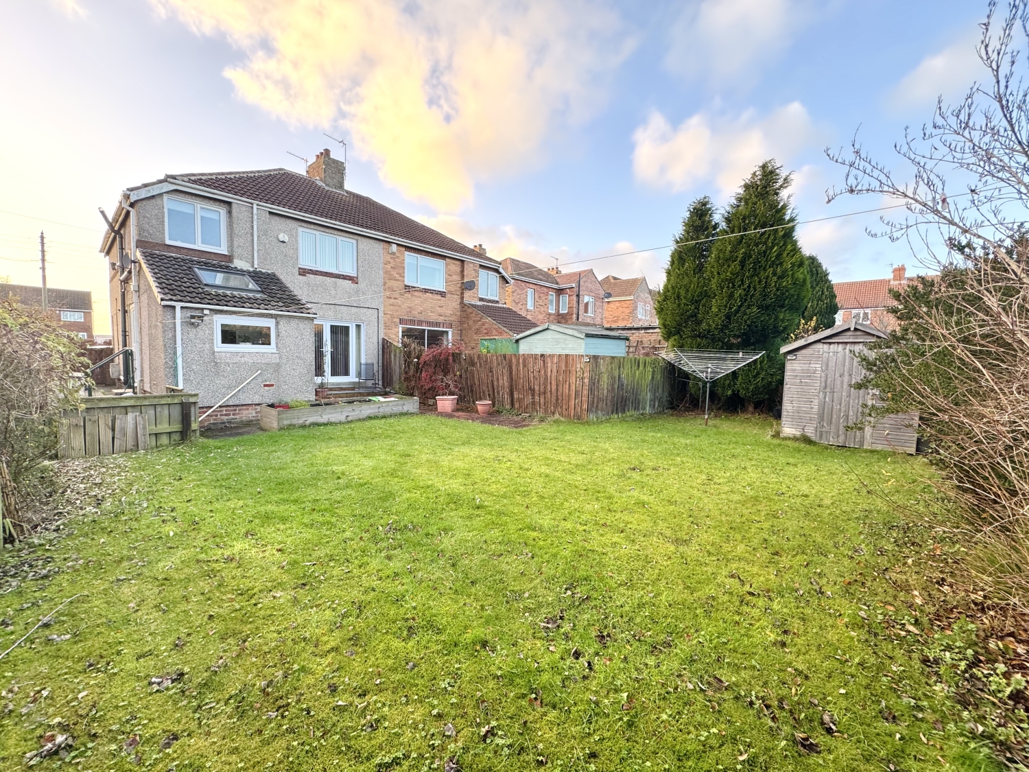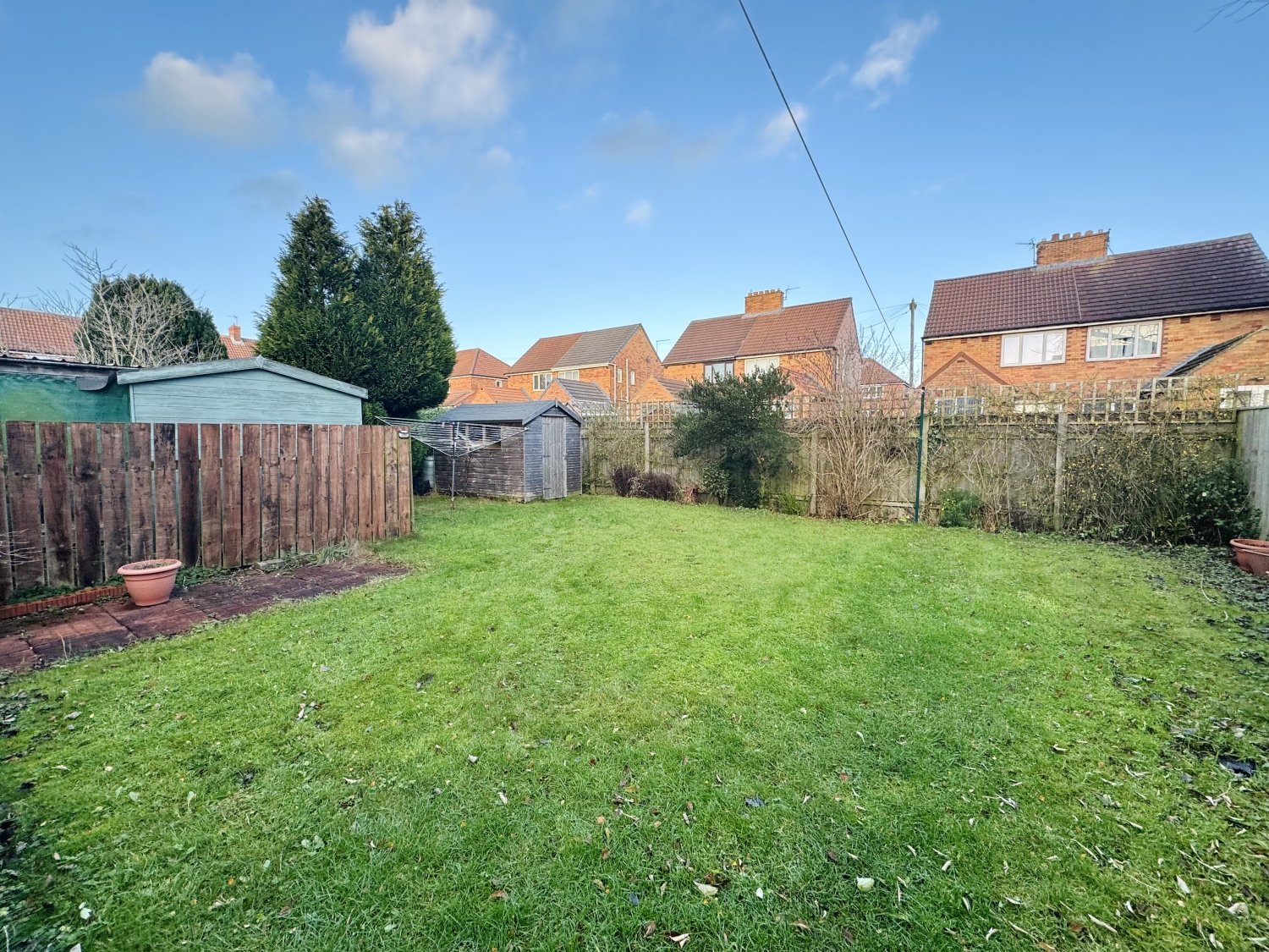 Outside, the rear garden is laid to lawn and includes a patio area ideal for outdoor dining, along with a shed for storage.