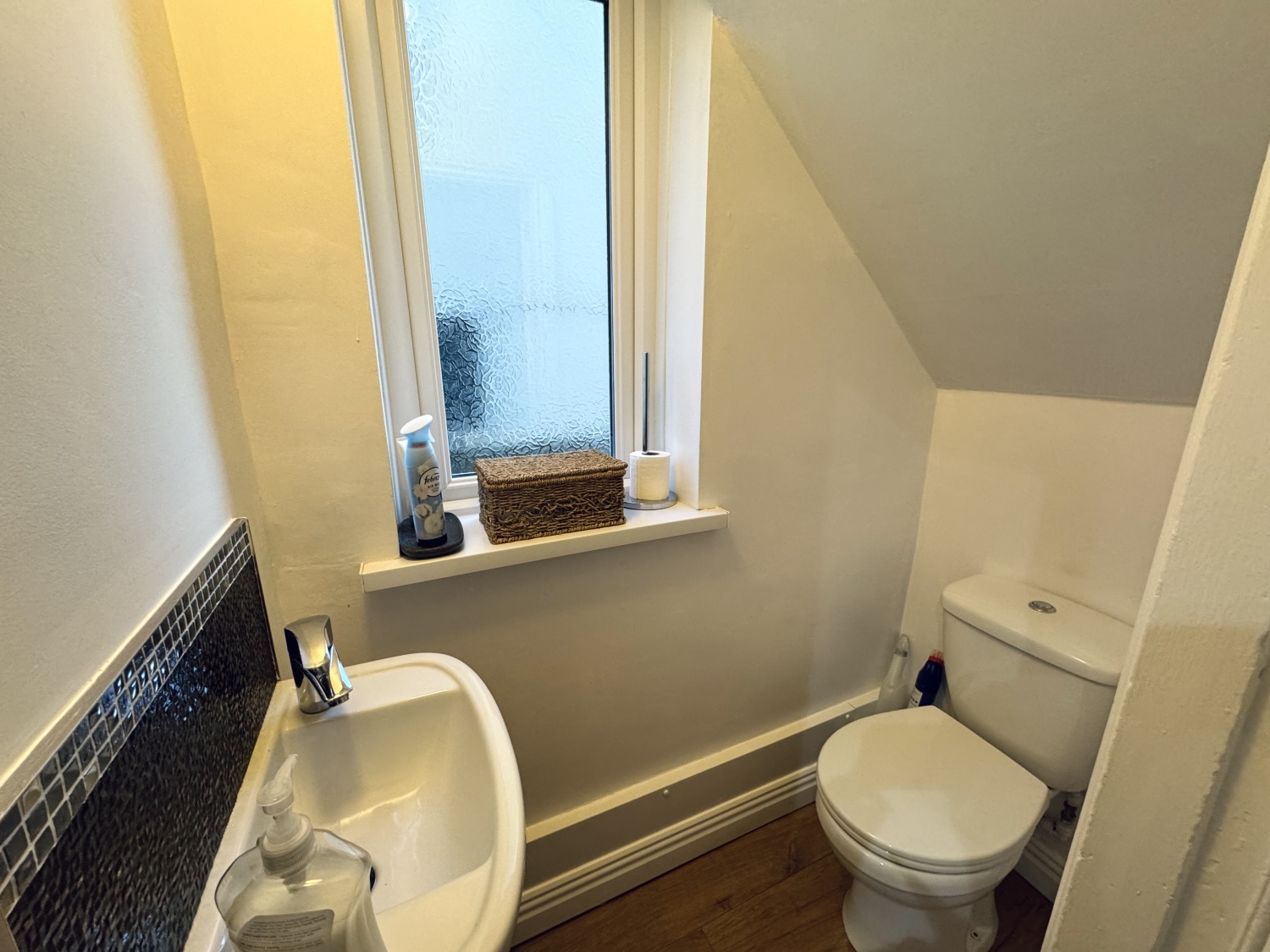 Low level w/c, wash hand basin, double glazed window to the side elevation