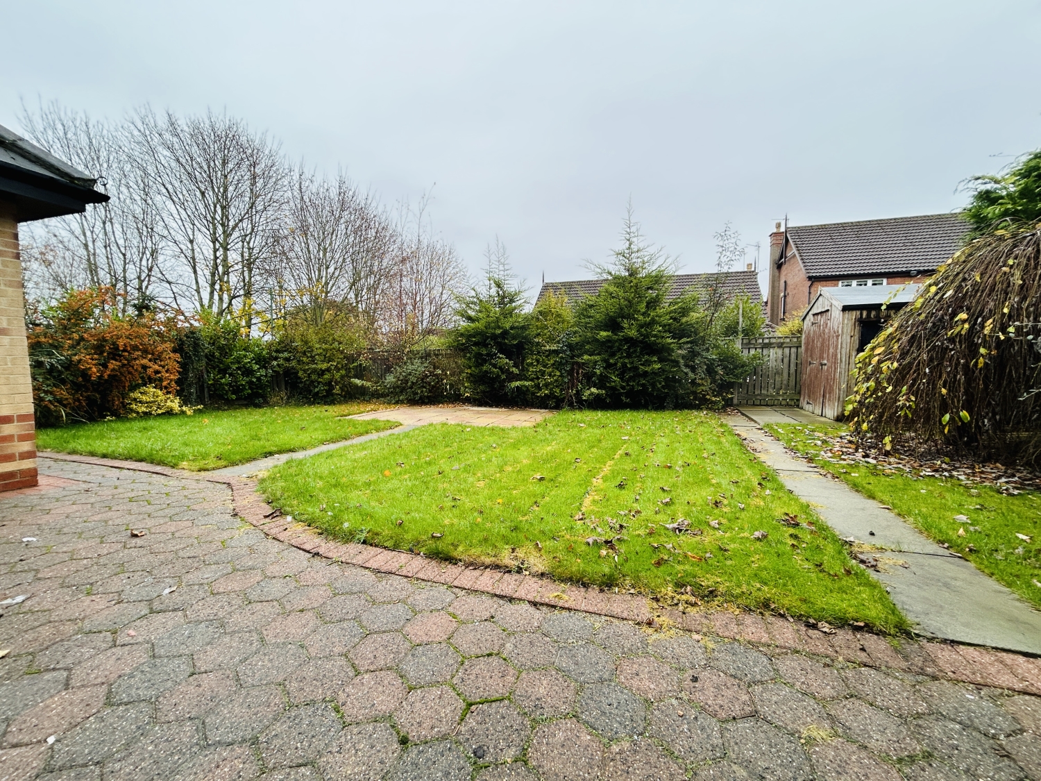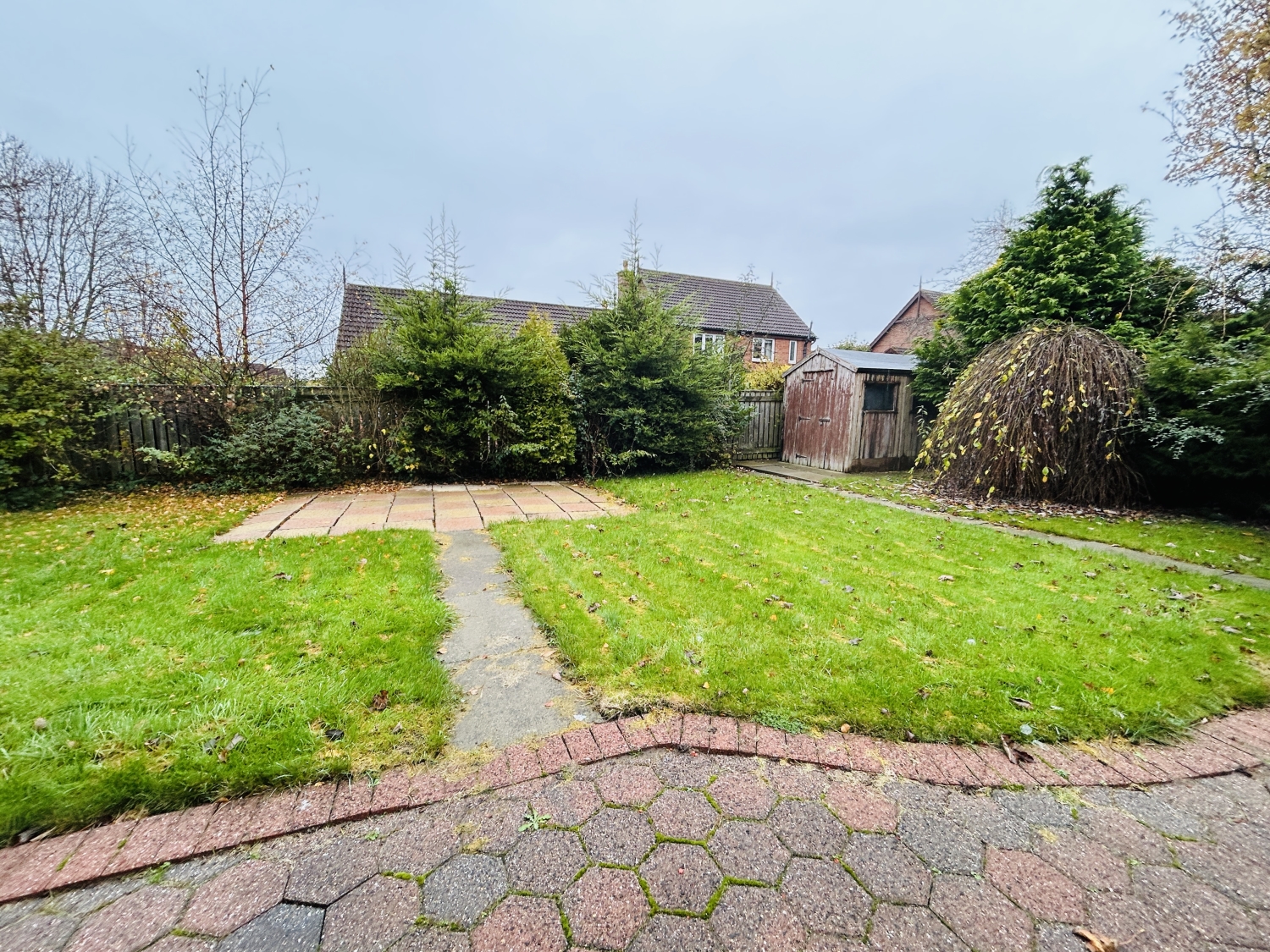 The rear garden is a true highlight—featuring a lawn, paved seating areas, mature shrub borders for privacy, and a practical garden shed.