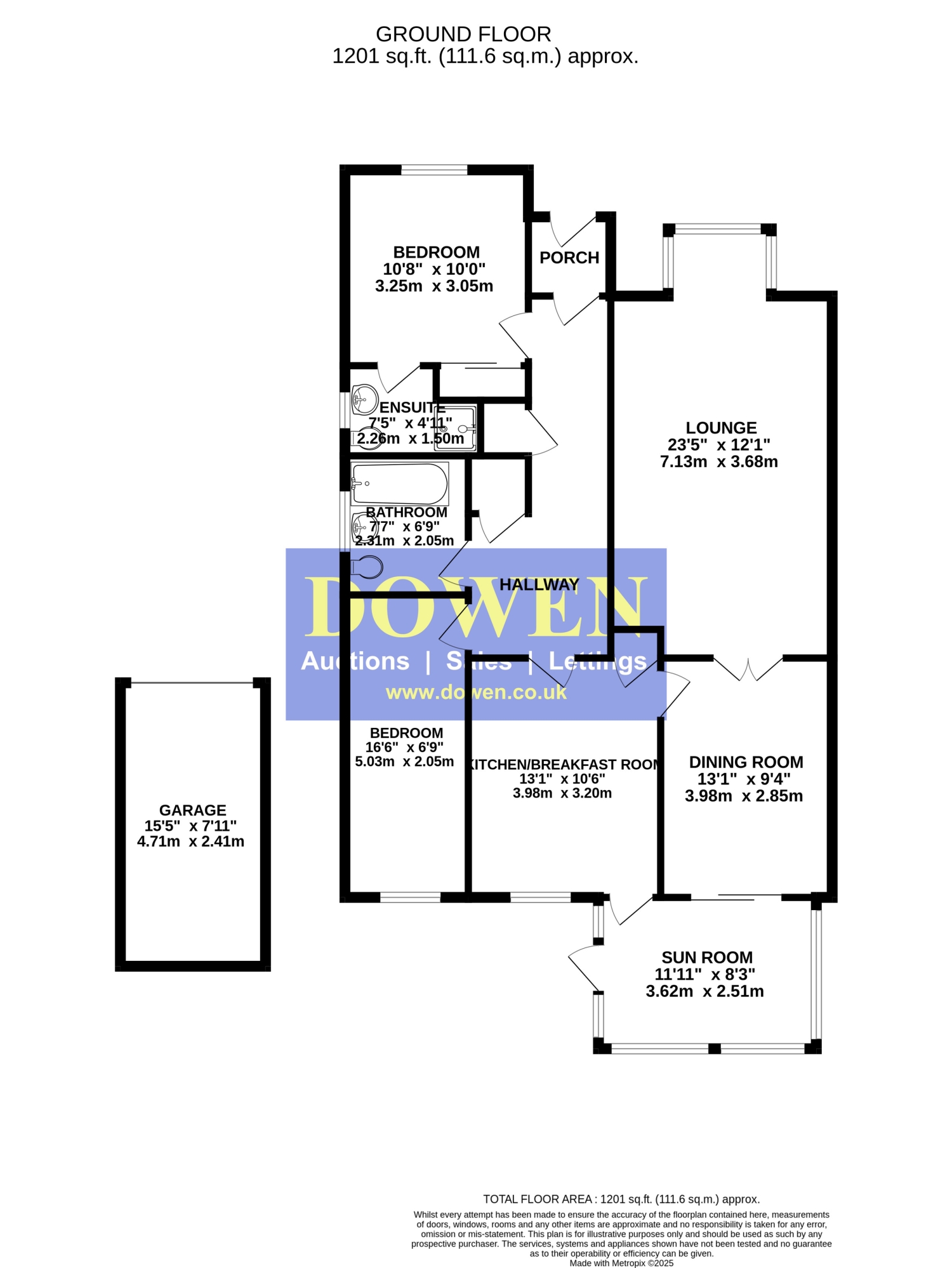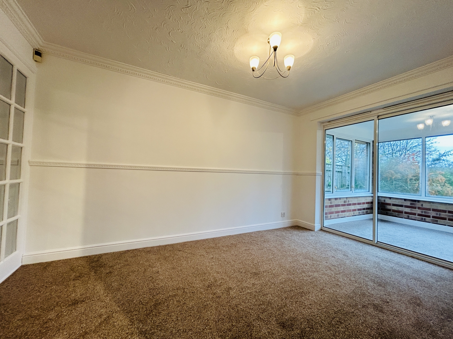 Covered storm porch leading to an entrance porch and welcoming reception hallway with two useful storage cupboards. Generous lounge with bay window and glazed French doors opening into a separate dining room. Garden room with delightful views over the private rear garden. Kitchen/breakfast room offering ample storage, worktop space, breakfast bar, and room for appliances. Two well-proportioned bedrooms, including a master with en-suite shower room. Refitted family bathroom/WC completing the accommodation. Externally, the property boasts an open-plan lawned garden to the front and a block-paved driveway providing parking for up to three vehicles, leading to a detached single garage.
