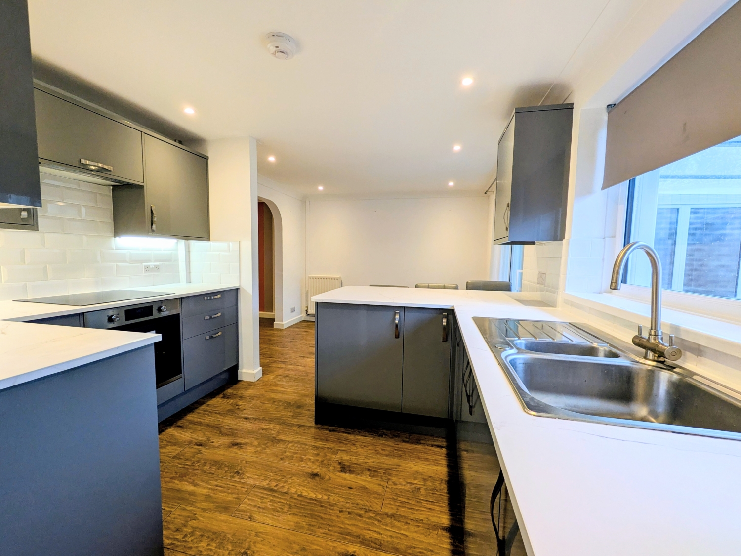 On the ground floor, the welcoming lounge sits at the front of the property and flows through an elegant archway into a contemporary kitchen diner. The kitchen is a true showpiece, featuring sleek grey high-gloss cabinets with downlighting for a modern finish. From here, an arch leads to a separate utility room, adding practicality to the home. There is also a conservatory, a downstairs cloakroom, and a formal dining room, giving you plenty of space for family life and entertaining.