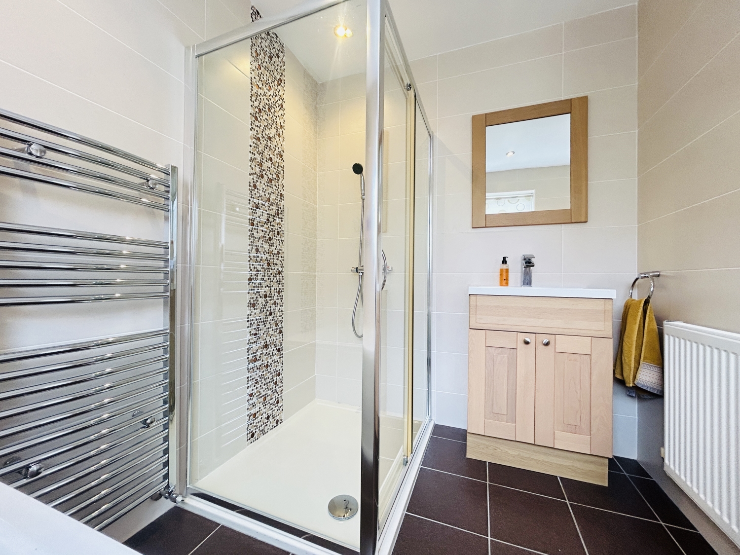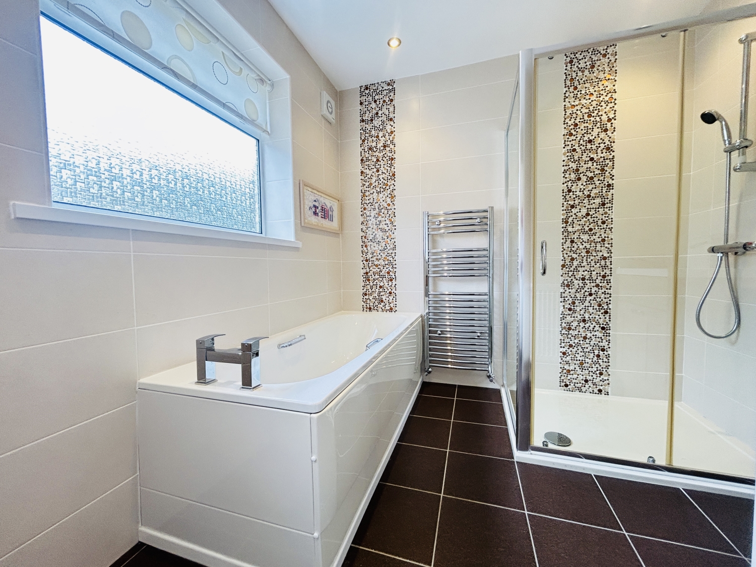 The entrance porch leads into an L-shaped reception hallway with a practical built-in storage cupboard. A large, double-aspect lounge with a feature gas fireplace flows into a superb open-plan kitchen and dining area, which provides an extensive range of storage units, ample worktop space, integrated eye-level oven, grill and hob with extractor hood, as well as an integrated dishwasher and housing for a washing machine. There is also space for a family dining table, making this an ideal space for entertaining. The hallway gives access to three generously sized double bedrooms, with fitted wardrobes to the master and second bedrooms. The attractive modern family bathroom has been refitted with a contemporary suite comprising a panel bath, WC, vanity sink and a separate low-rise shower enclosure.
