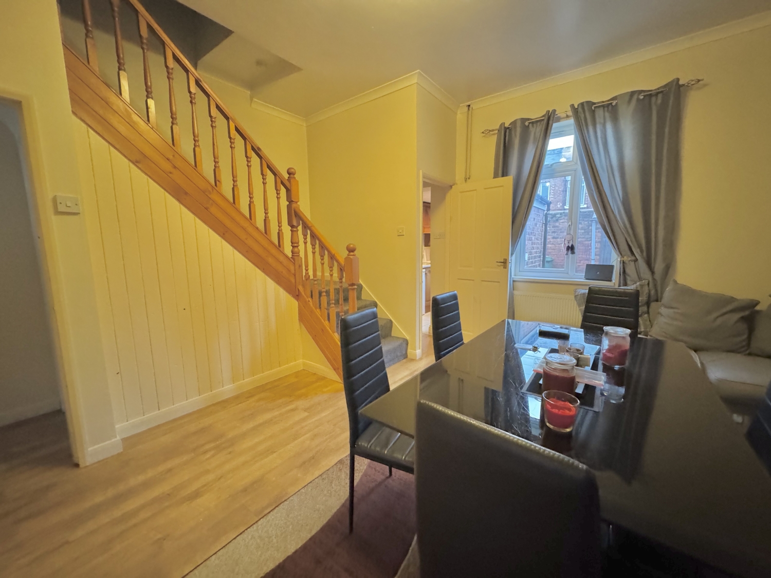 The ground floor welcomes you with an entrance hallway leading through to a bright dining room. From here, stairs rise to the first floor, while double doors open into a spacious lounge, creating a comfortable and versatile living area. A well‑kept kitchen completes the ground floor accommodation.