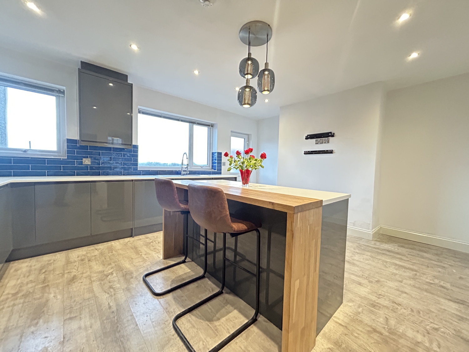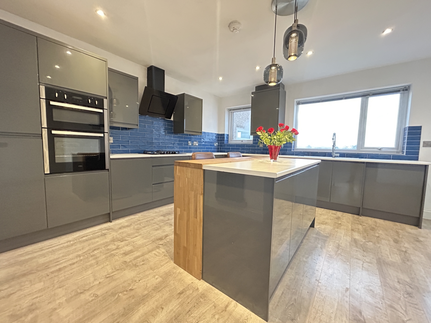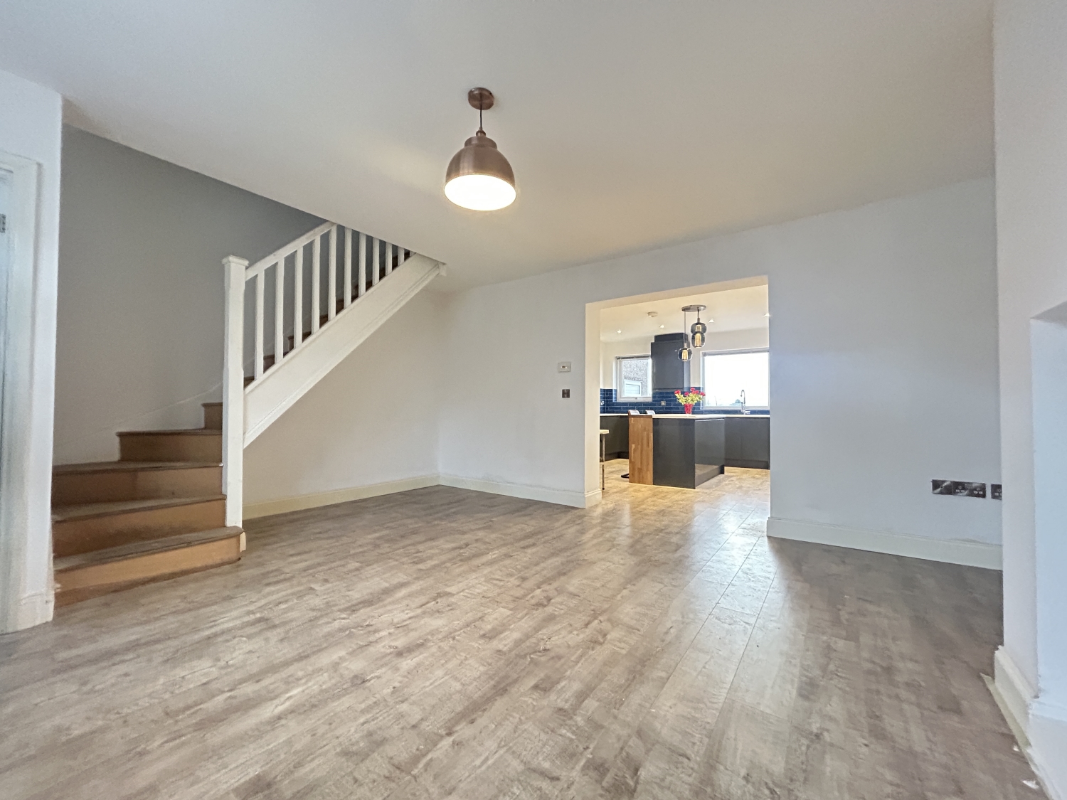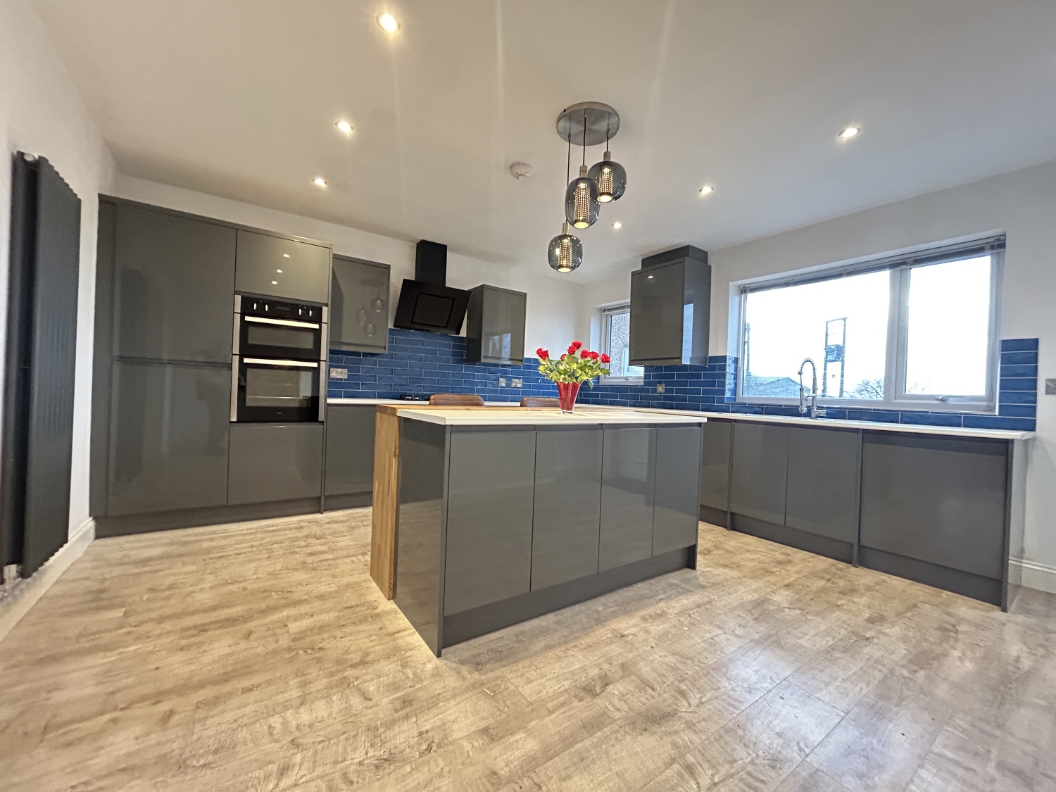 The accommodation begins with an entrance porch that opens into a spacious lounge featuring a fireplace recess, open staircase to the first floor, and an archway flowing through to the superb refitted kitchen and dining room. The stunning kitchen includes sleek modern units incorporating an integrated five‑ring hob with extractor, double oven, fridge freezer, dishwasher, and washing machine. The central island provides additional storage and preparation space and incorporates a practical breakfast bar.
