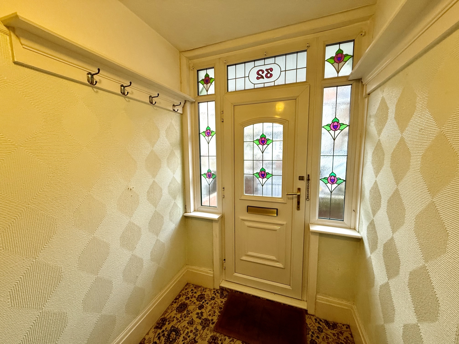 Entered via a UPVC door with a stained glass side insert window, stairs to the first floor and useful under stair storage cupboard.