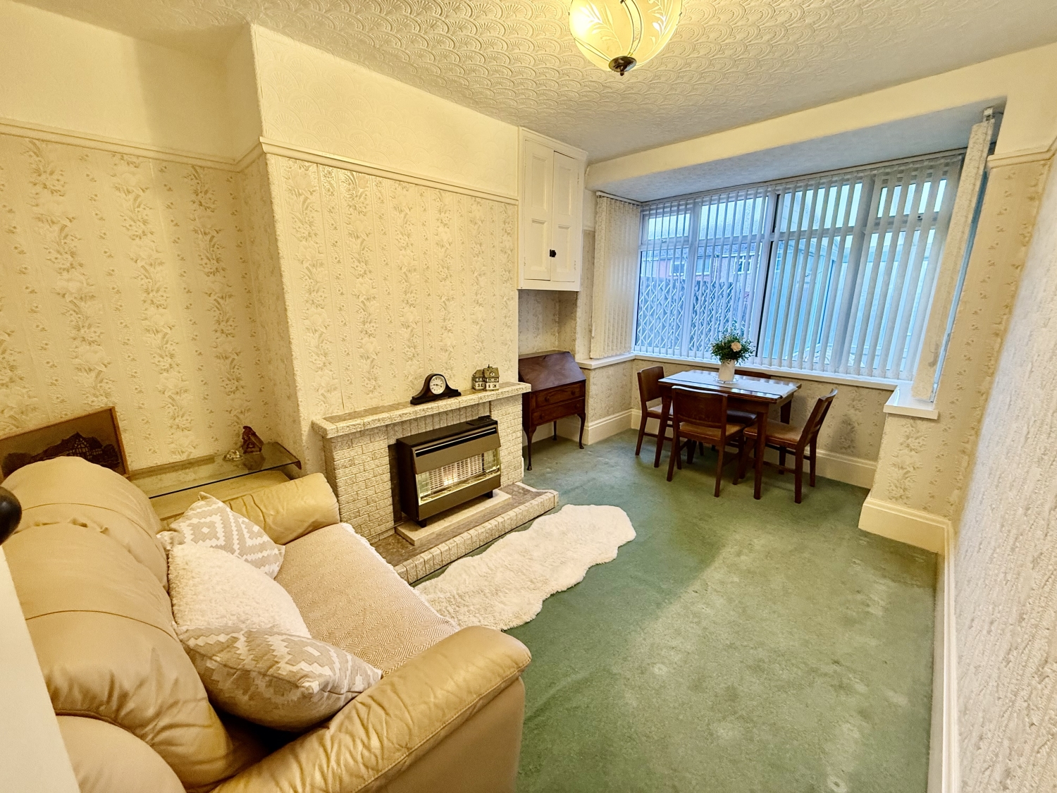 Double glazed UPVC bay window to the rear and tile feature fire place housing a gas fire.