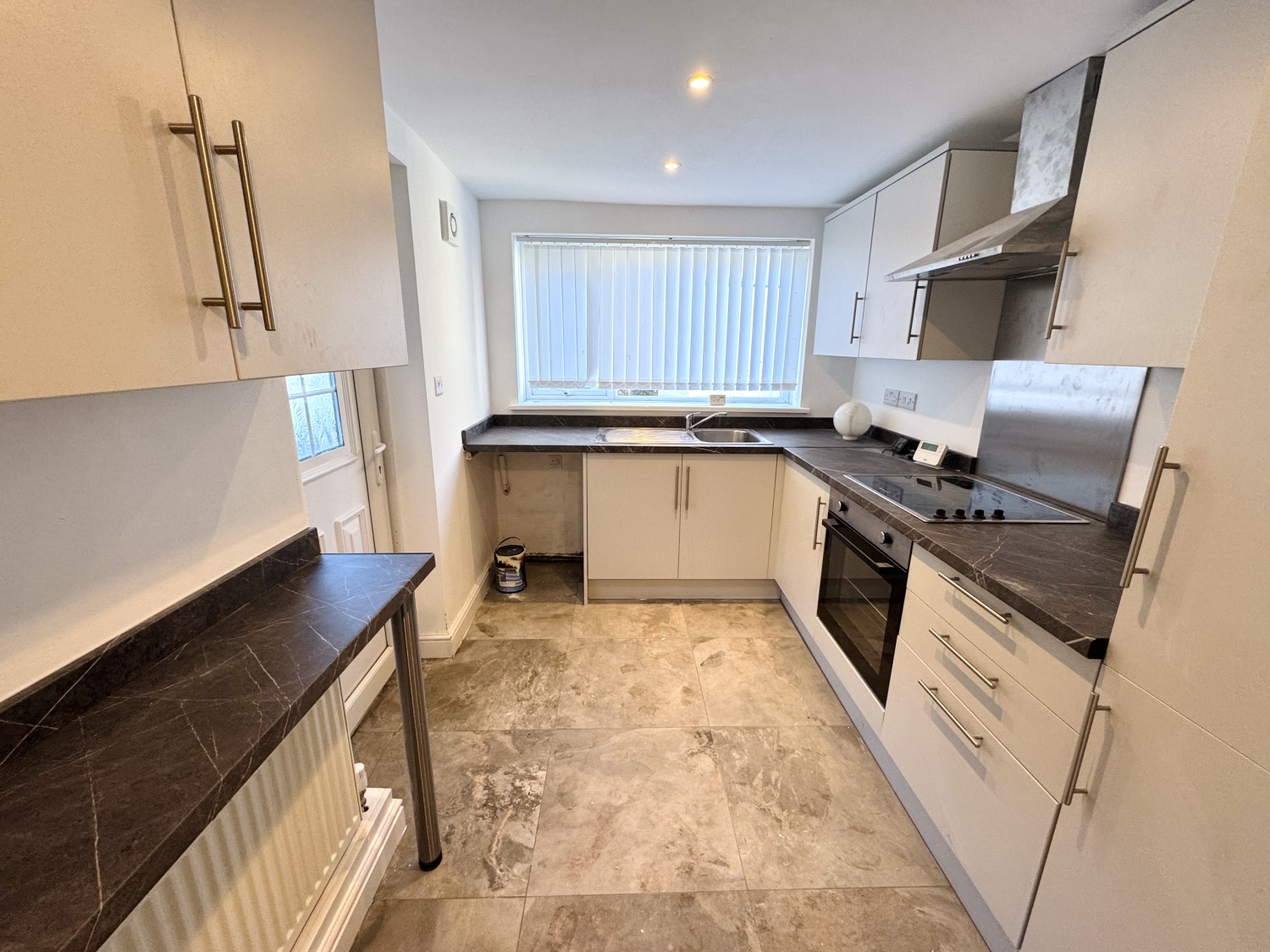 Fitted with a range of wall and base units with complementing work surfaces, stainless steel sink with drainer and mixer tap, electric hob, electric oven, extractor hood, space for fridge/freezer, space for washing machine, radiator, double glazed window to the rear elevation