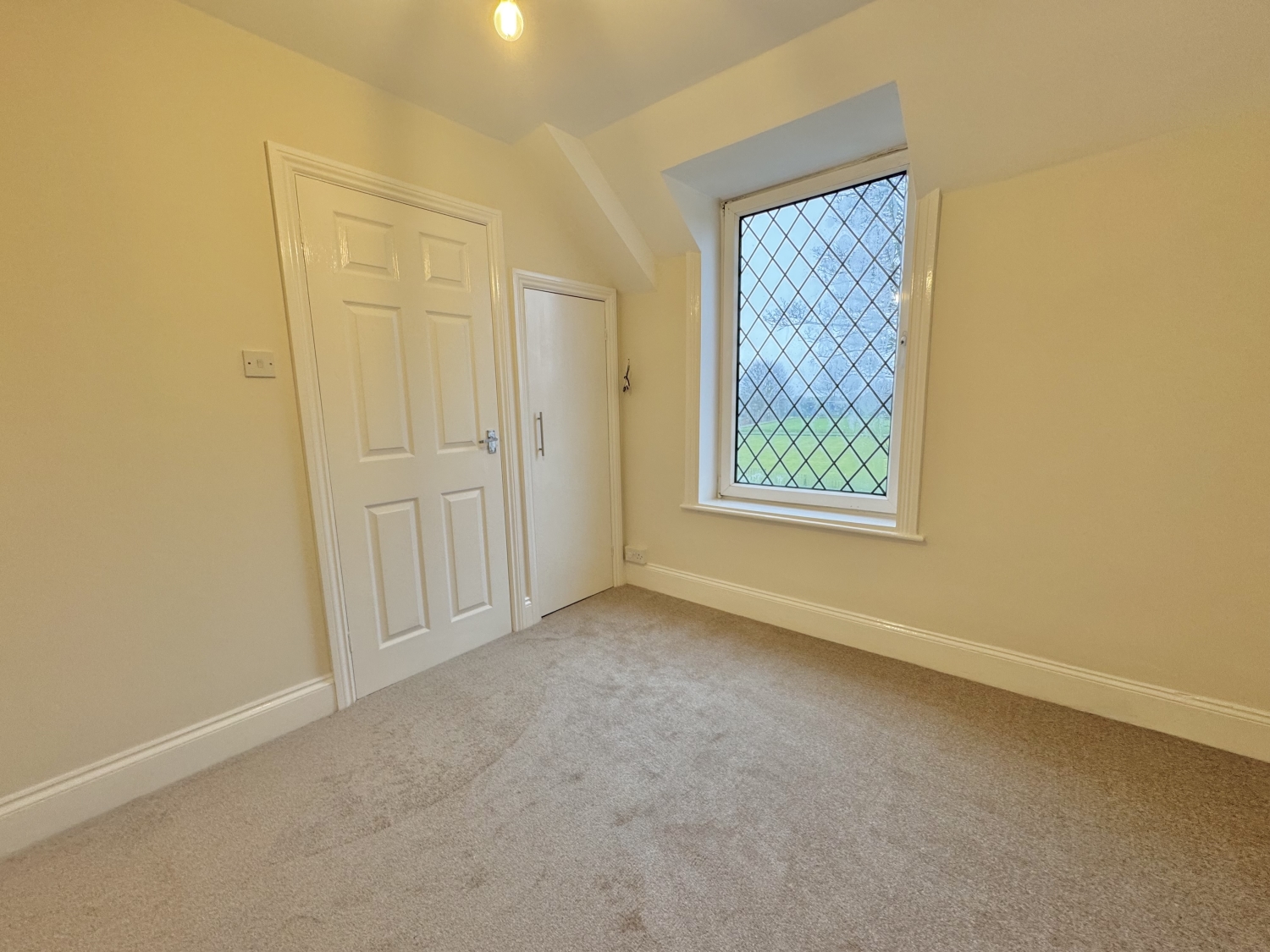 The property opens with a welcoming entrance hall offering excellent storage, leading into a spacious lounge featuring high ceilings and a charming walk‑in bay window that fills the room with natural light.