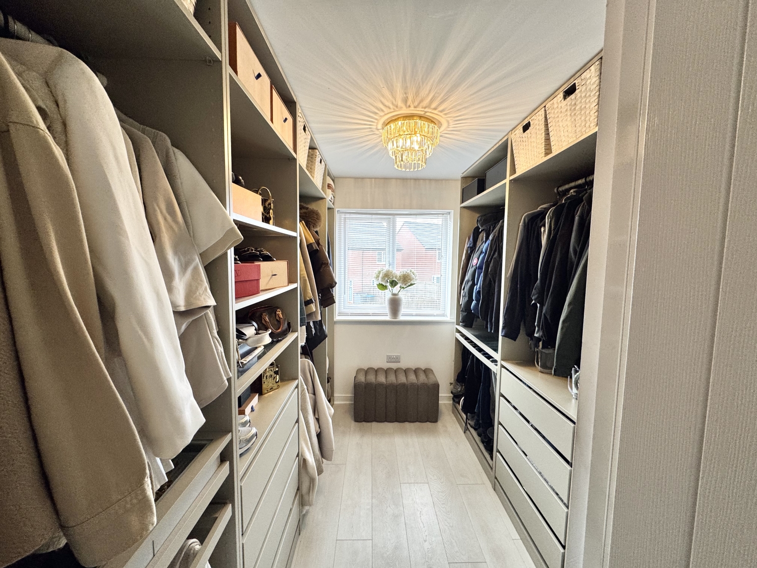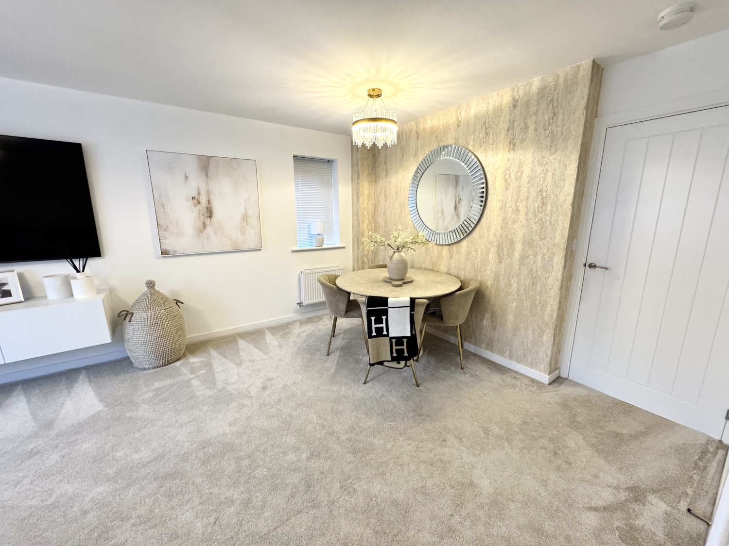 To the rear, the impressive 20ft living and dining room spans the full width of the home, creating a bright and versatile space for relaxation and family life. Feature wall panelling adds character, while a large storage cupboard provides excellent practicality. Patio doors open directly onto the south‑facing rear garden, allowing natural light to flood the room and offering a seamless connection between indoor and outdoor living.