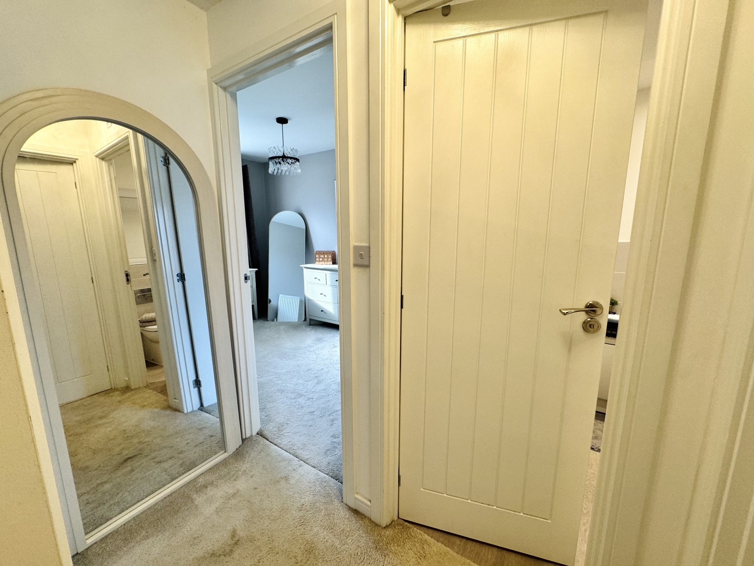 Upstairs, the landing leads to three well‑proportioned bedrooms. The master bedroom benefits from its own en‑suite shower room, giving a touch of luxury and convenience. The remaining bedrooms are tastefully decorated and served by a modern family bathroom.