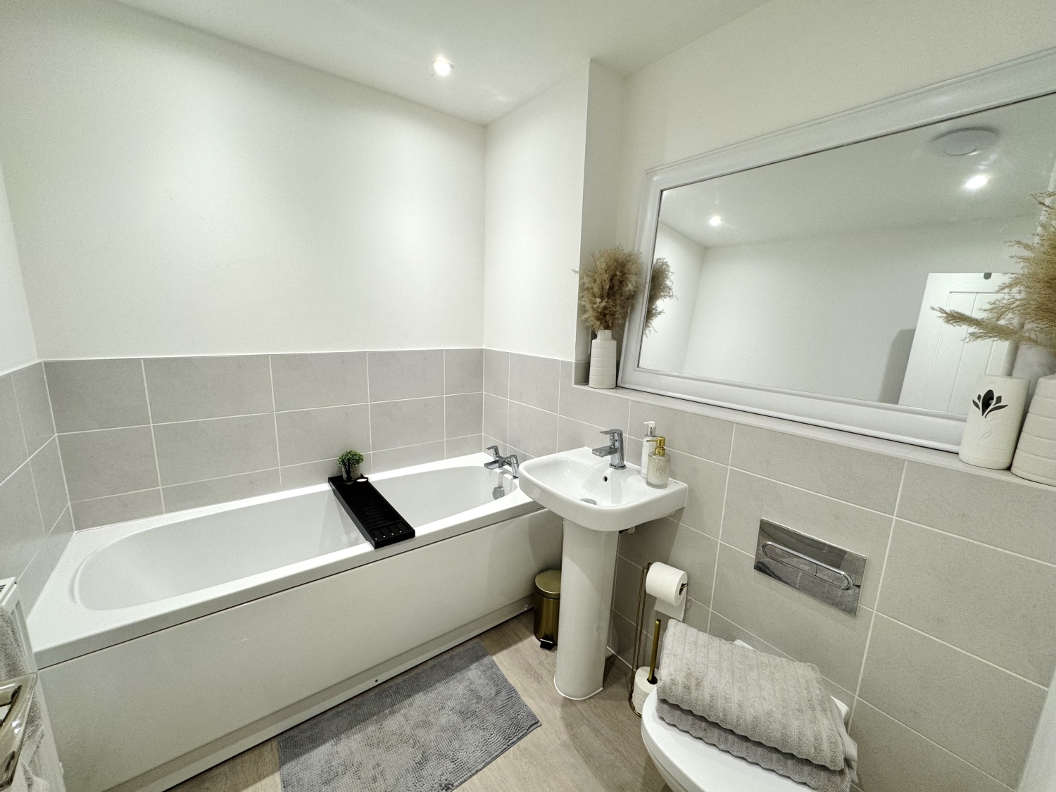 Fitted with a 3 piece suite comprising of; Bath, pedestal wash hand basin, low level w/c, radiator, part tiled walls, extractor fan, spotlights to ceiling