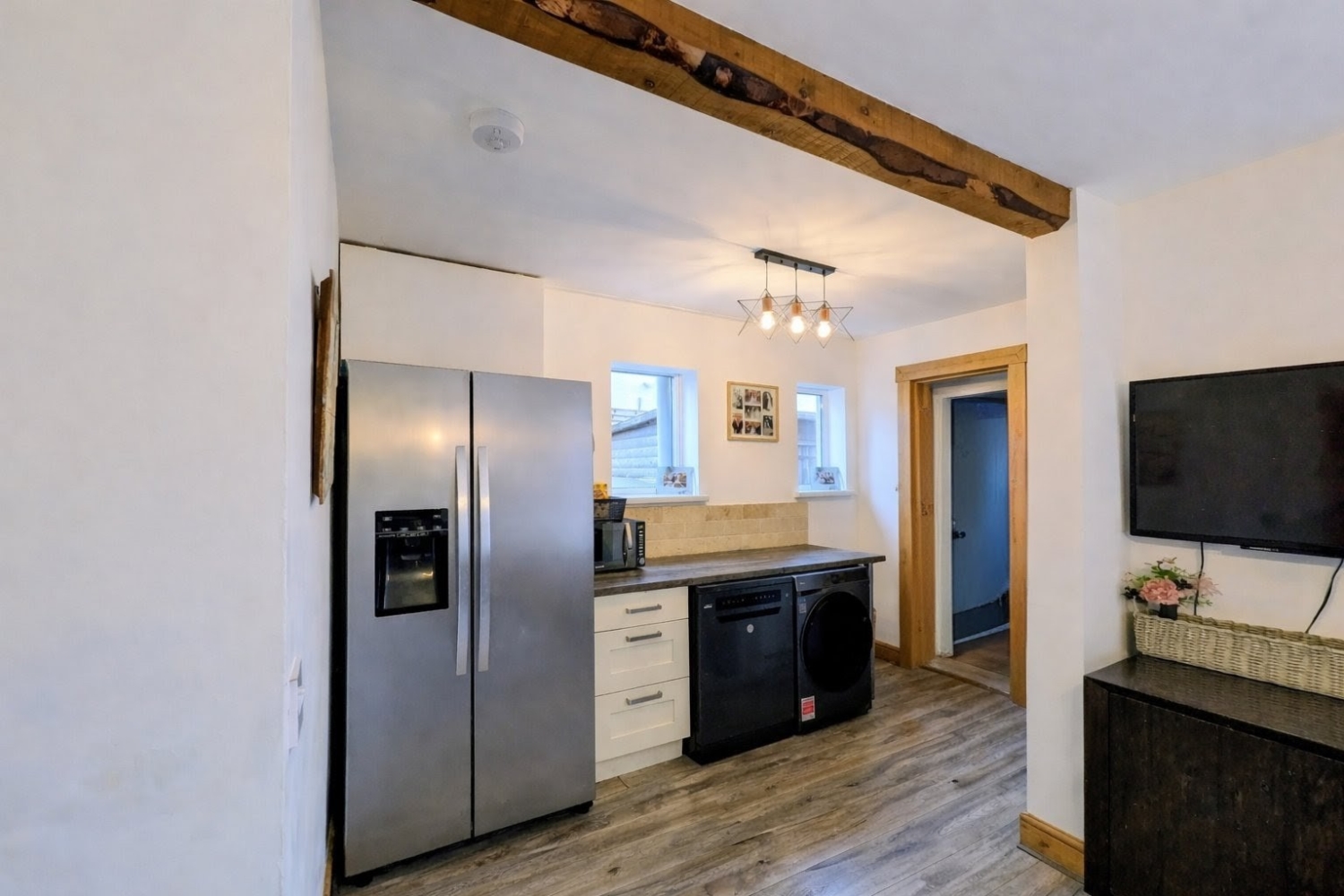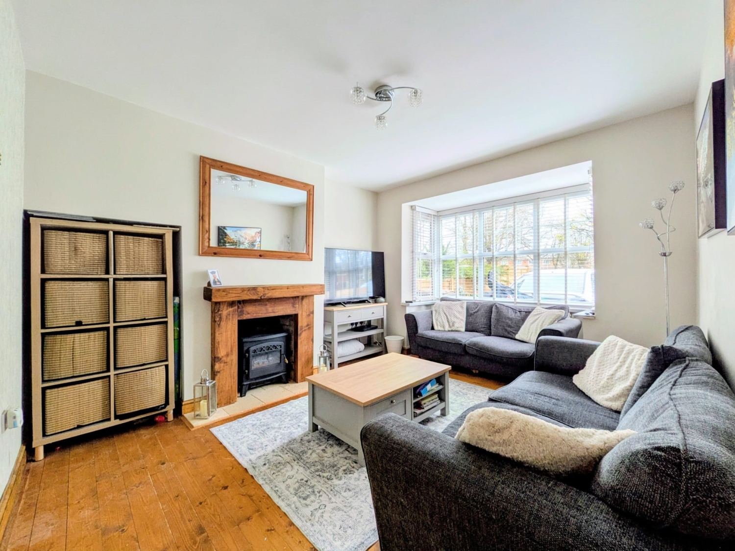 The lounge exudes a cosy, rustic charm, featuring a characterful inglenook fireplace, exposed sanded and varnished floorboards, and stylish plantation shutters — creating a warm and welcoming space to relax.