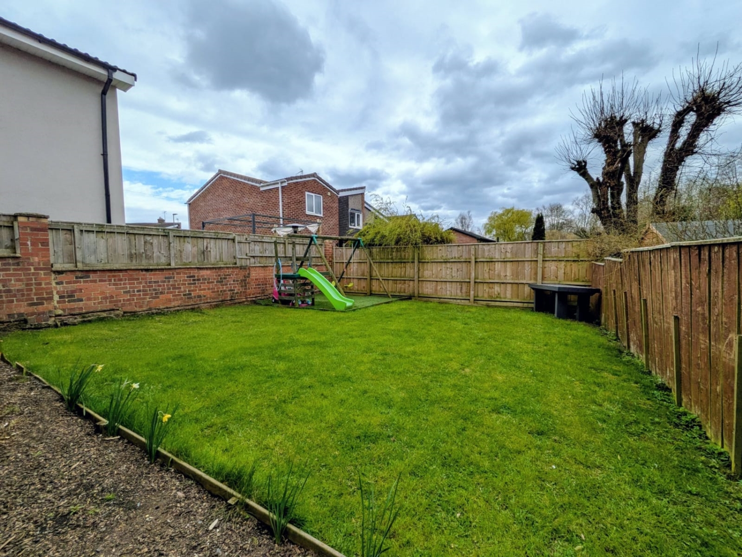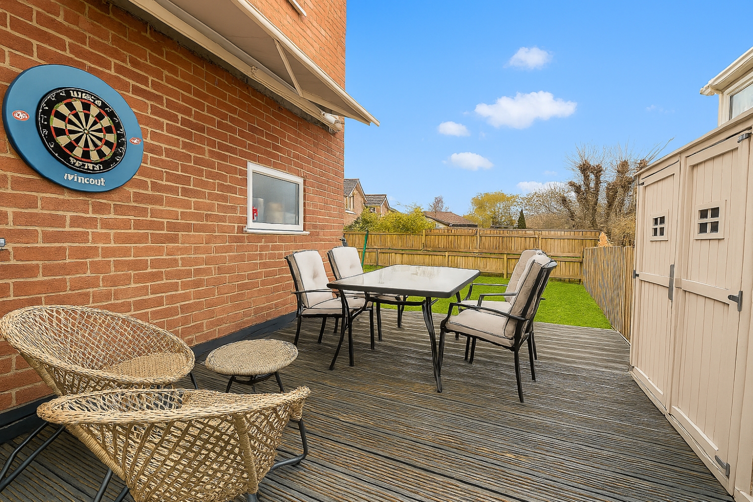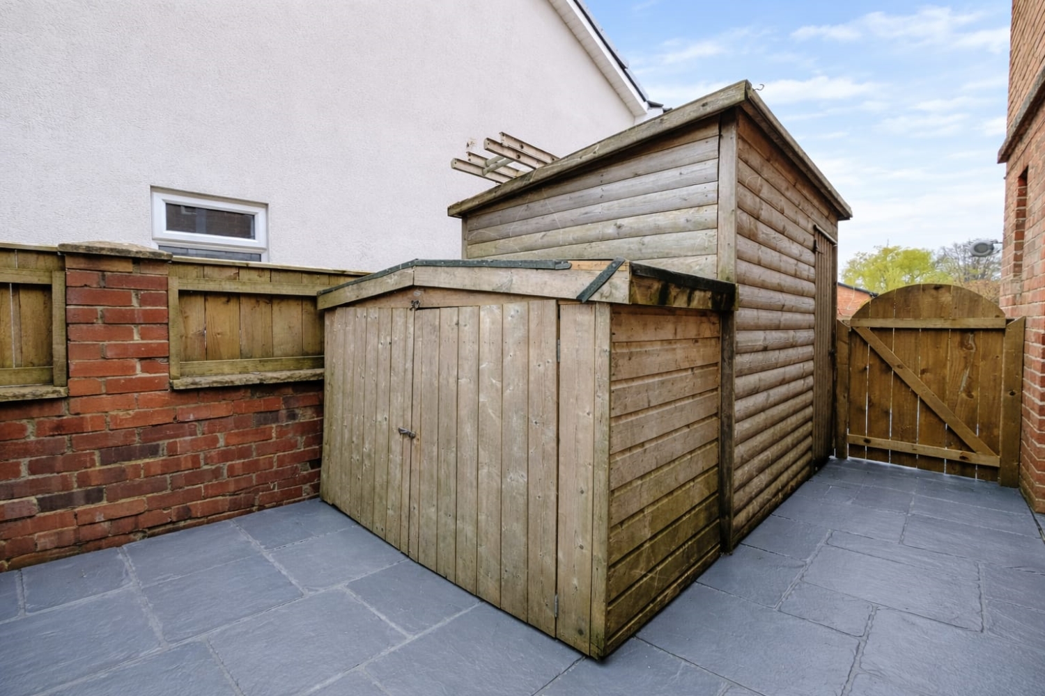 Externally, the garden is predominantly laid to lawn and offers a generous decked seating area, perfect for outdoor dining and summer evenings. Two useful sheds provide excellent additional storage.
