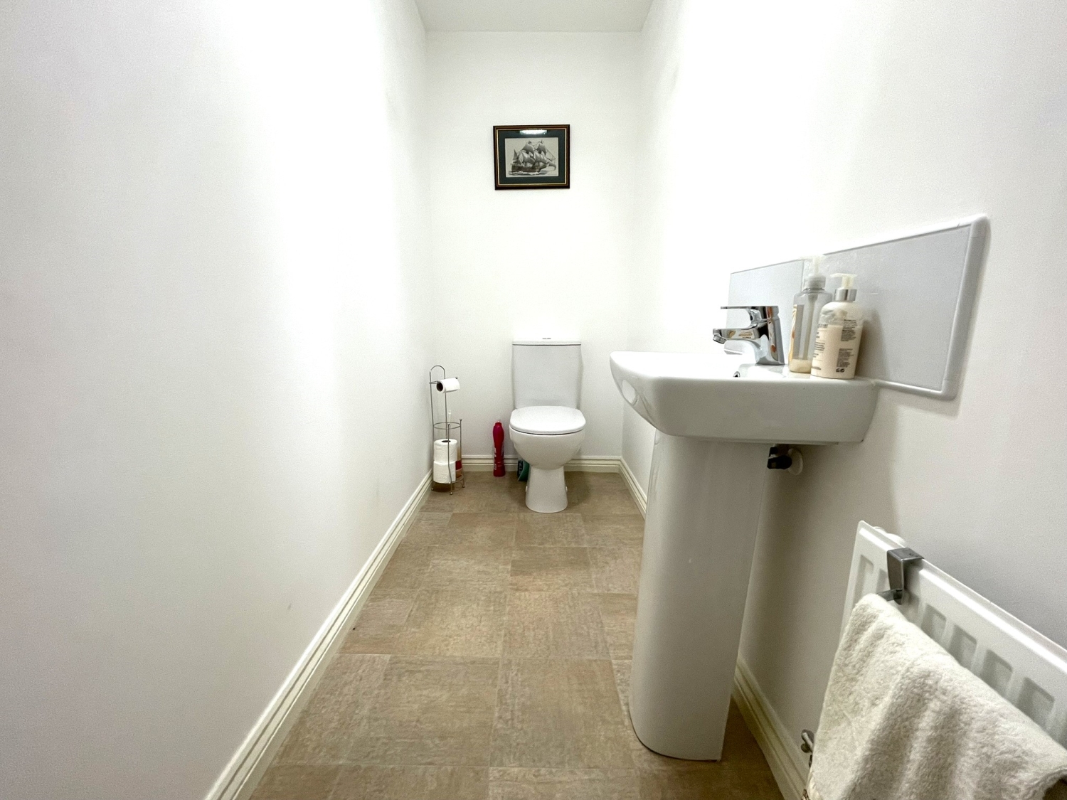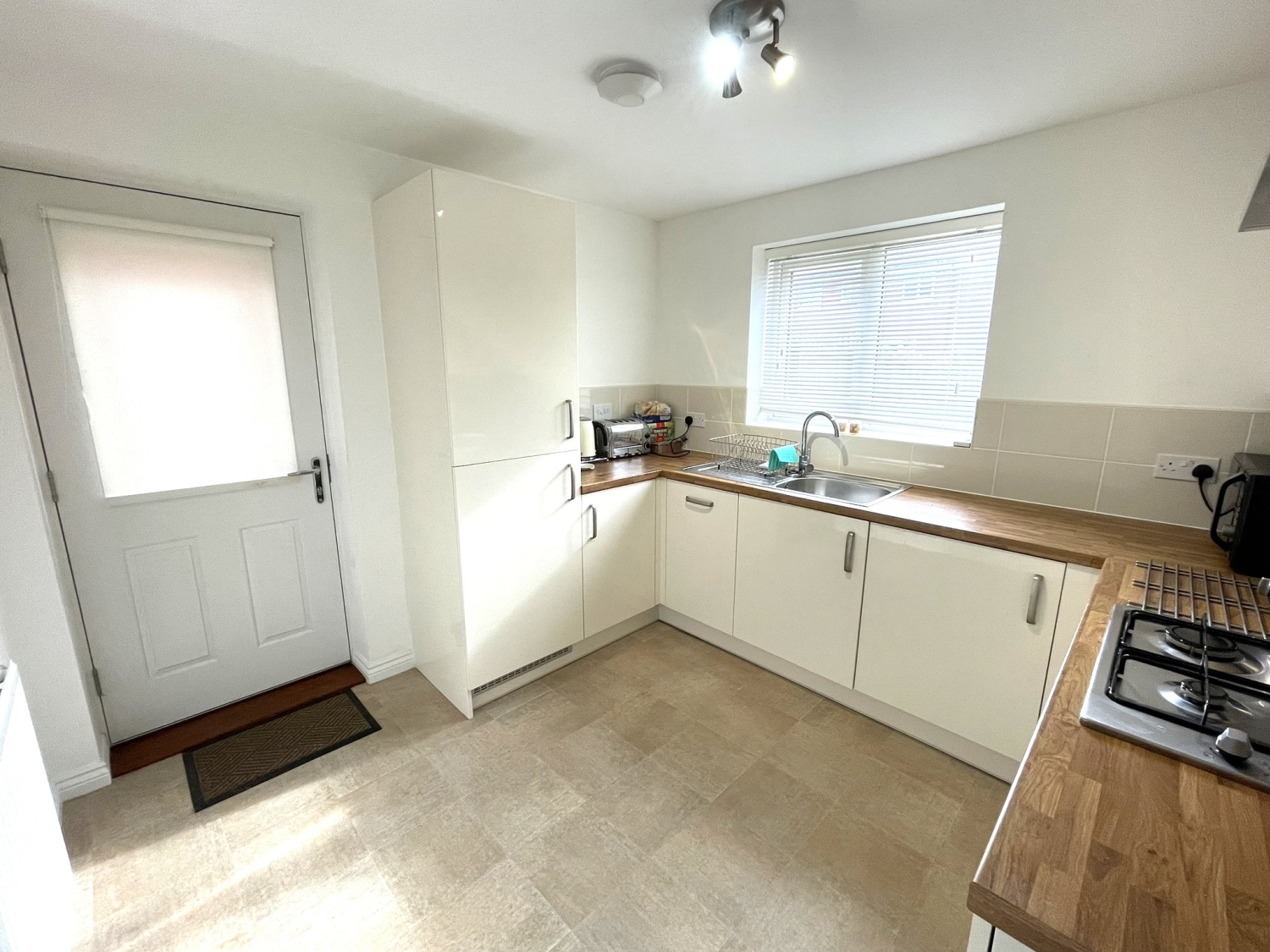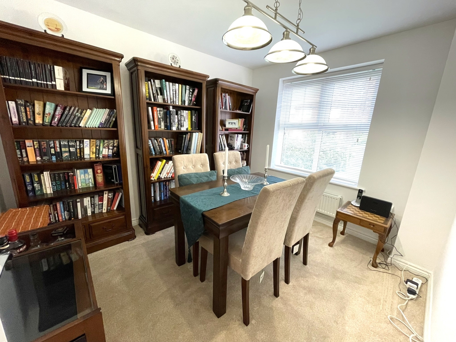 The property is entered via a welcoming hallway which leads to a separate dining room, perfect for entertaining, along with a convenient downstairs WC. To the rear, the generous lounge enjoys plenty of natural light and features patio doors opening directly onto the rear garden, creating a seamless indoor‑outdoor living space. The modern kitchen is well equipped with a range of integrated appliances and offers a contemporary finish.