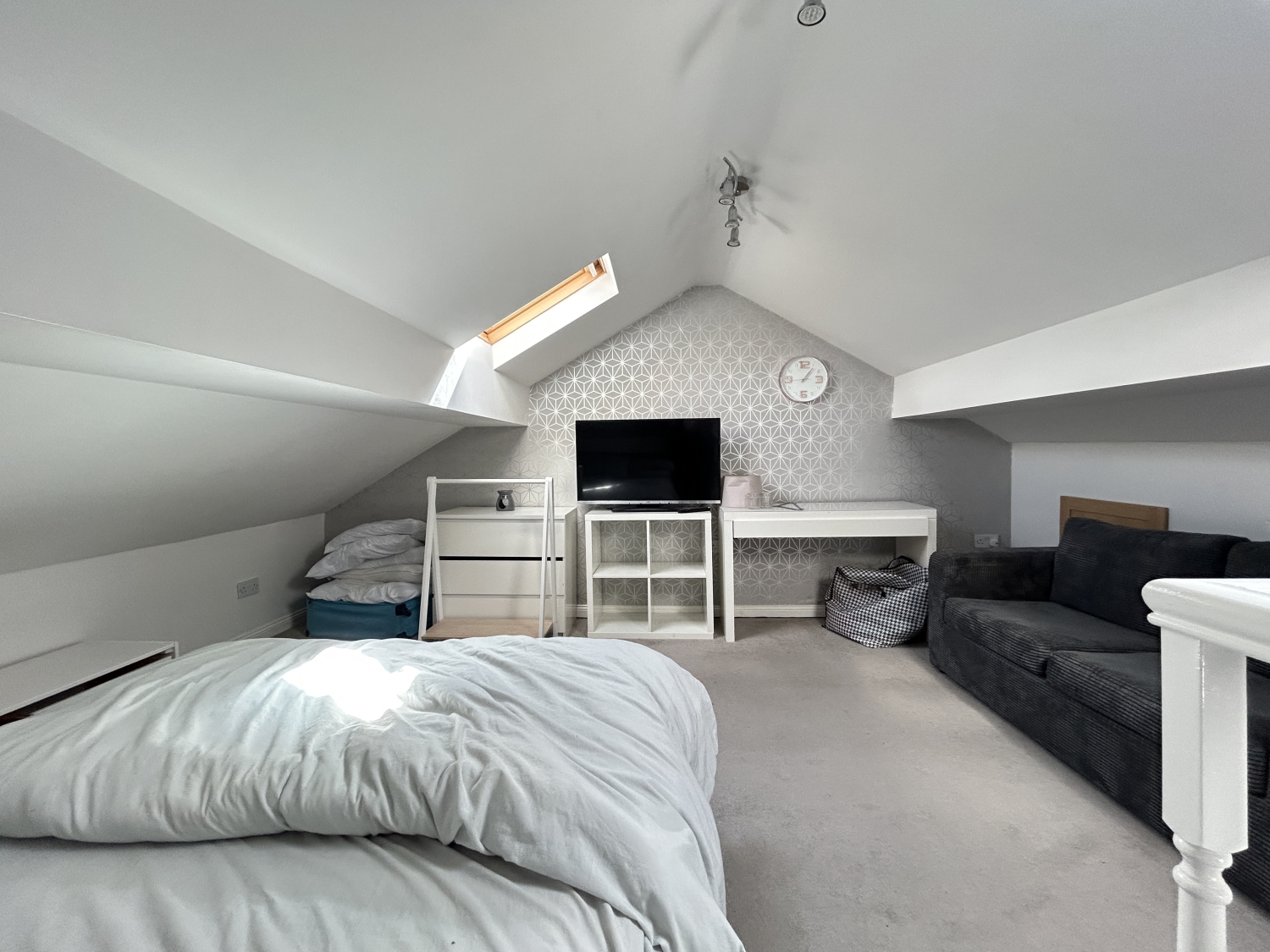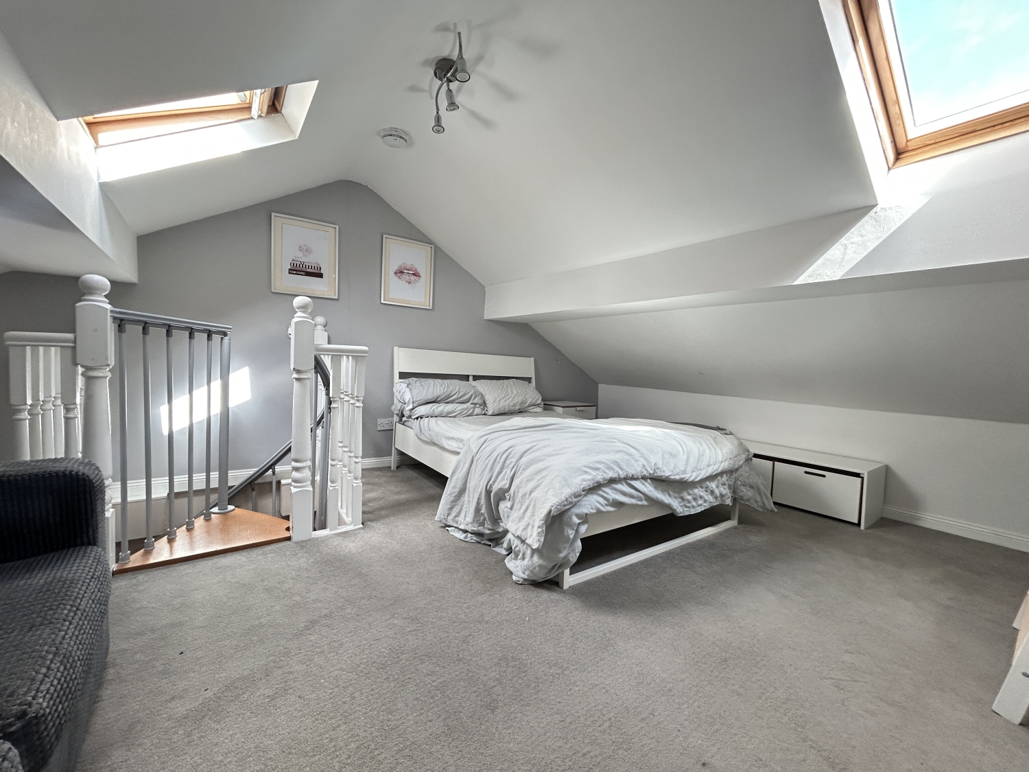 To the first floor are two generous double bedrooms, with the principal bedroom enjoying the added luxury of a spacious walk‑in wardrobe. Completing the accommodation is a stylish and well‑appointed bathroom/WC, featuring a separate shower cubicle. A stylish spiral staircase from the landing leads to a useful attic room with skylight windows, light and power, an ideal study/home office space.