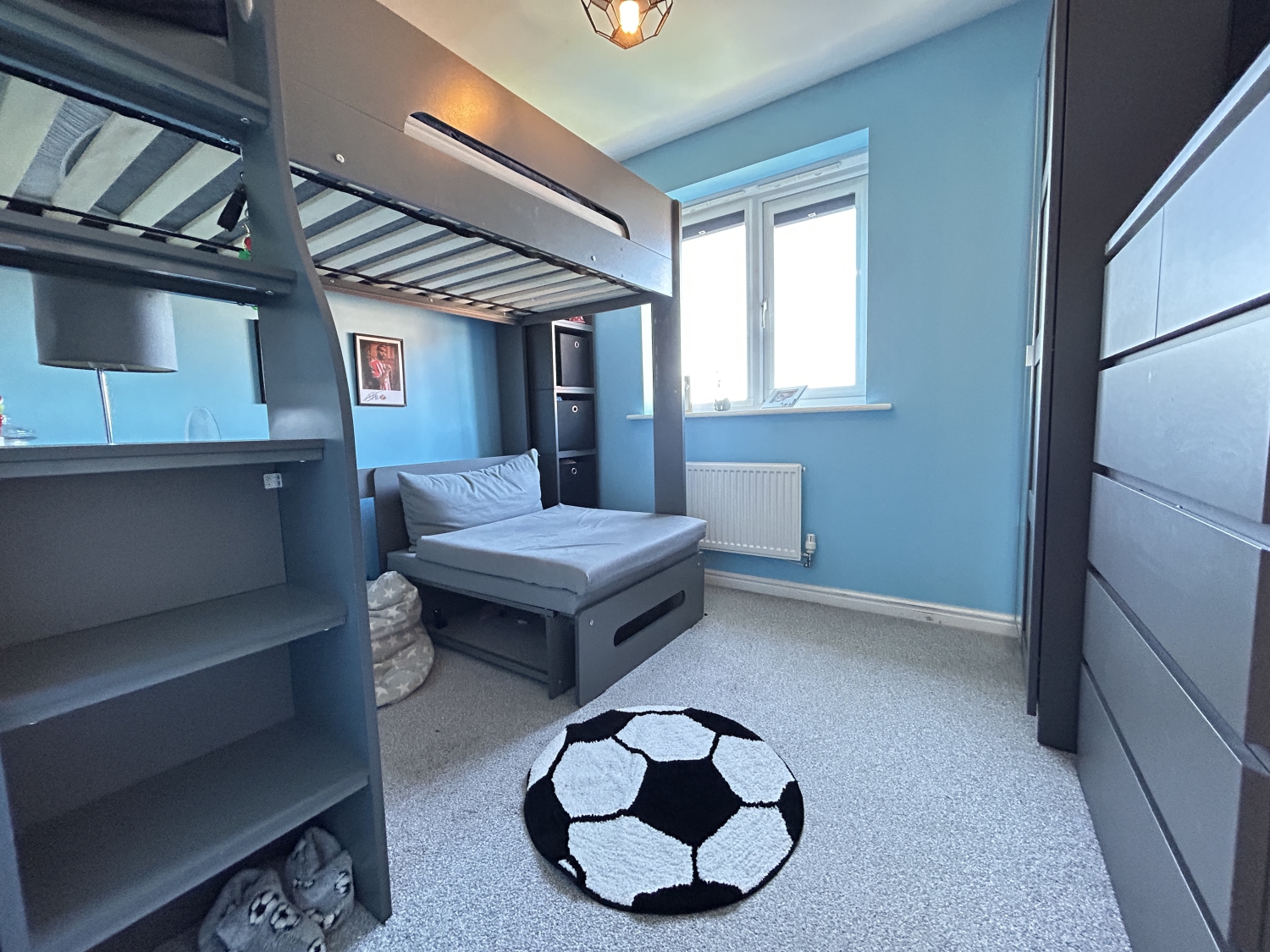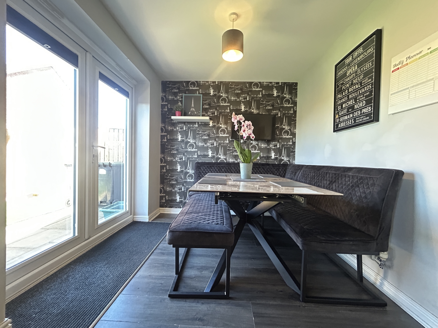 Occupying a quiet cul-de-sac position with open green space to the front, the accommodation briefly comprises a welcoming entrance hall giving access to the study and a spacious living room. An inner hallway leads to a ground-floor cloakroom/WC and a return staircase rising to the first floor. Completing the ground floor is a contemporary open-plan kitchen and dining room, fitted with a modern range of units, integrated oven and hob, and space for additional appliances. UPVC double-glazed French doors open directly onto the rear garden, creating a bright and sociable living space.