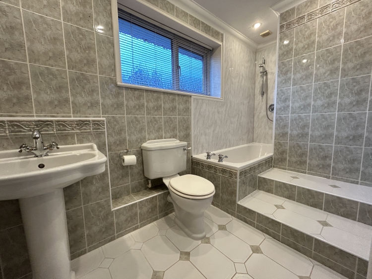 3.4544m x 2.667m - 11'4" x 8'9"<br>Panelled bath with mains fed shower, pedestal hand basin, wc, fully tiled walls, tiled floor, heated towel rail, recessed downlights, cornice.
